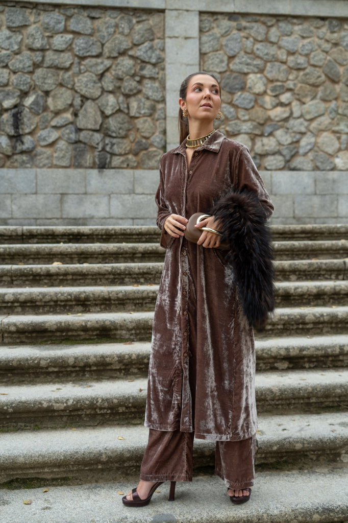 Conjunto formado por kaftan manga larga, abotonado y pantalón cintura engomada, bolsillos laterales. En color topo.