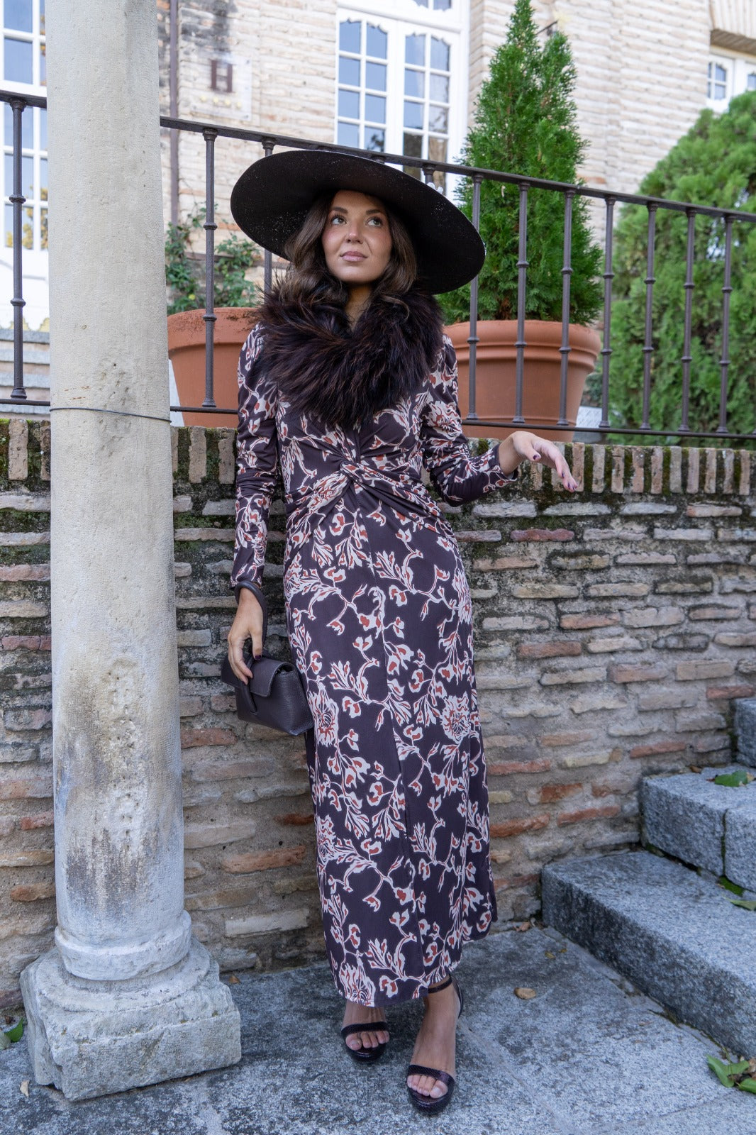 Vestido midi, escote a pico terminado en nudo, corte en cintura, abertura delantera, en color marrón con estampado.