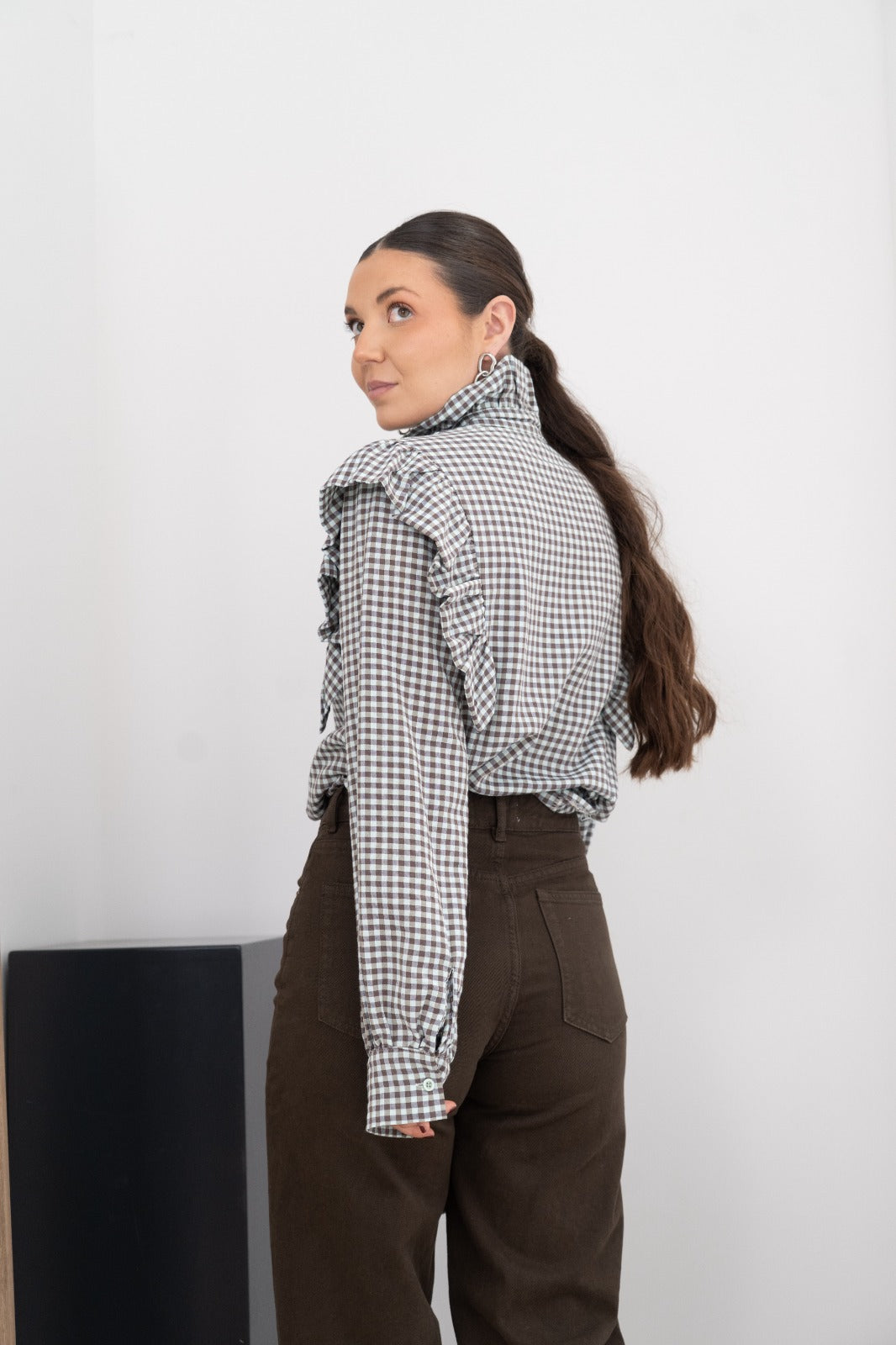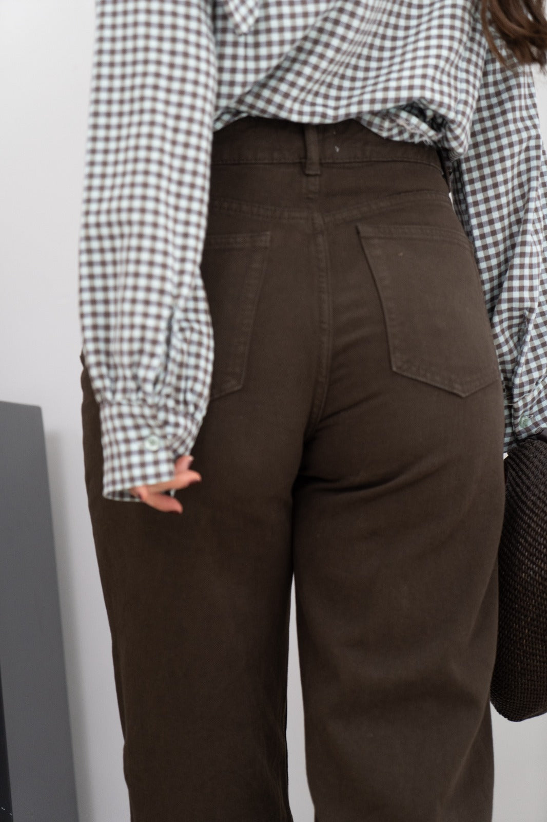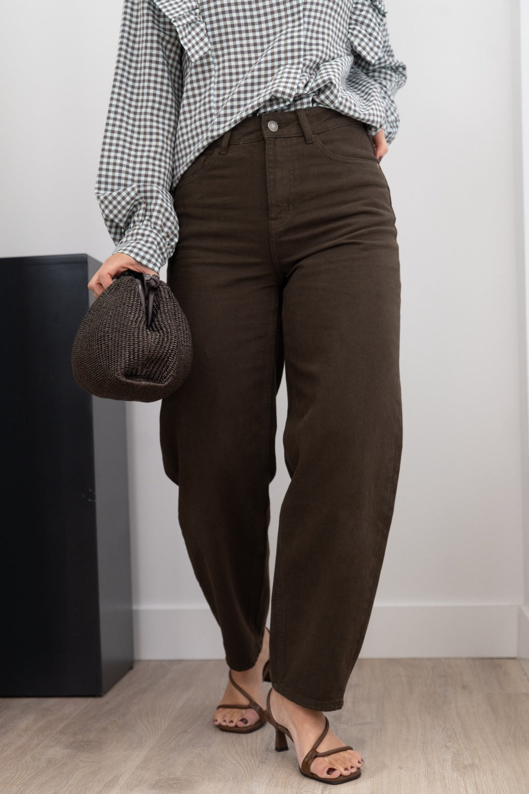 Pantalón vaquero tiro alto, bolsillos traseros y bolsillos delanteros, recto. En color marrón.