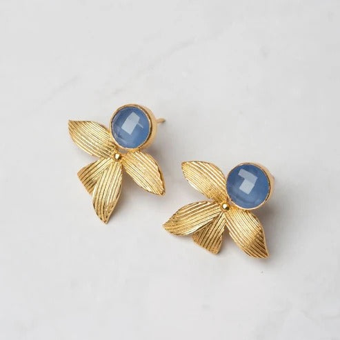 Cada pendiente presenta cuatro hojas que culminan en una piedra circular en la parte superior, cierre con tuerca.
