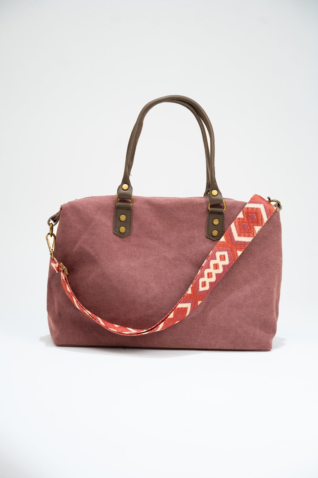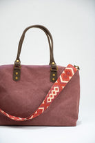 Bolso en loneta, con asas fijas en piel y correa extraíble y ajustable de algodón en color marrón chocolate. Cierre con cremallera, forro interior en negro y bolsillo interior. En color burdeos.