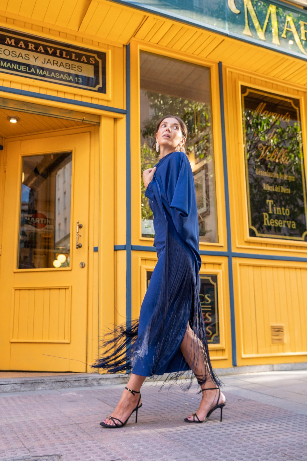 Vestido midi, escote redondo subido con tira transparente, manga francesa, abertura trasera, caftán con flecos y fajín. En color azul.