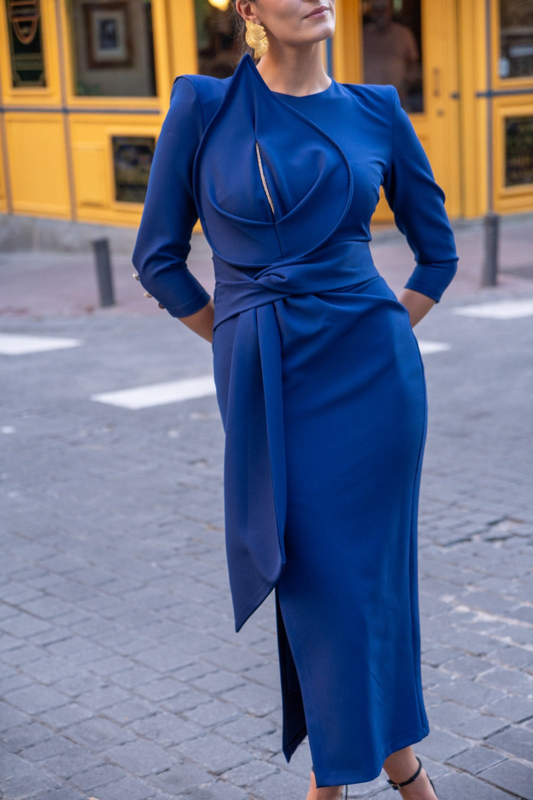 Vestido midi, escote redondo, manga larga con detalles botones, hoja en el pecho, cinturon y abertura a un lado. En color azul.