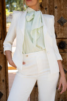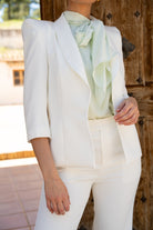 Chaqueta americana , manga francesa, ciere con boton en el centro, hombrera lata. En color blanco.