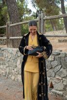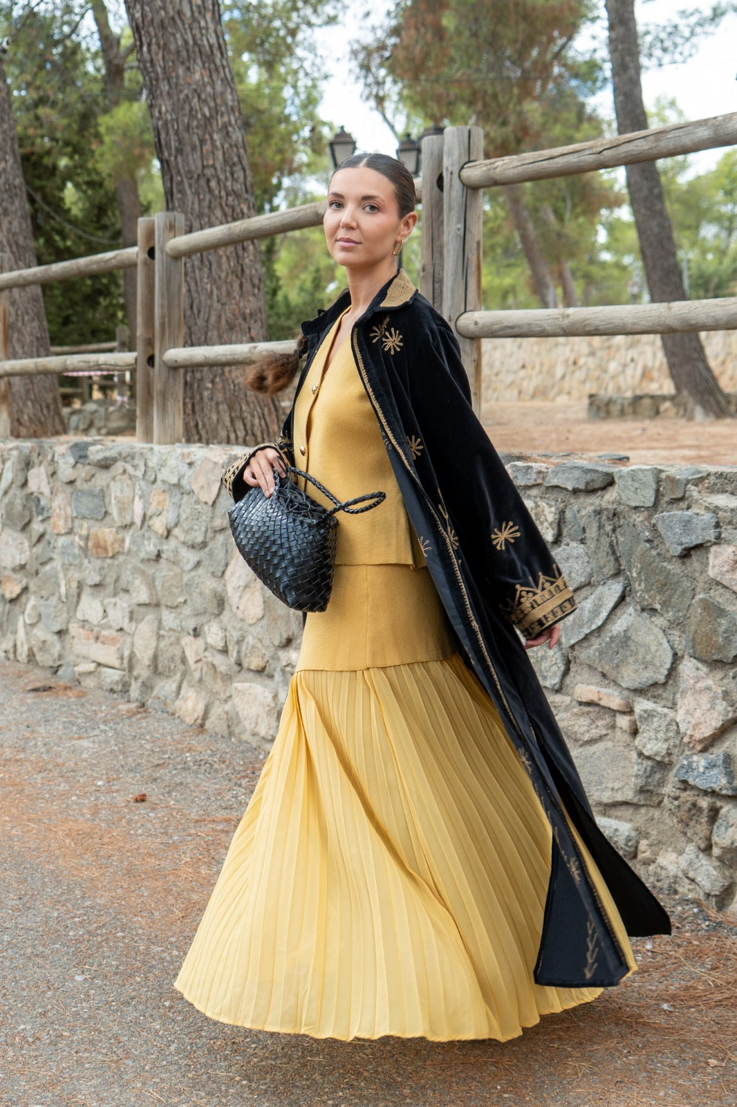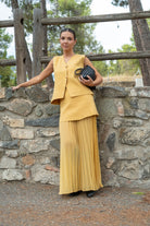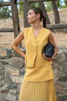 Conjunto punto, compuesto por chaleco escote pico, abotonado y falda en punto con plisado en la parte de abajo. En color mostaza.