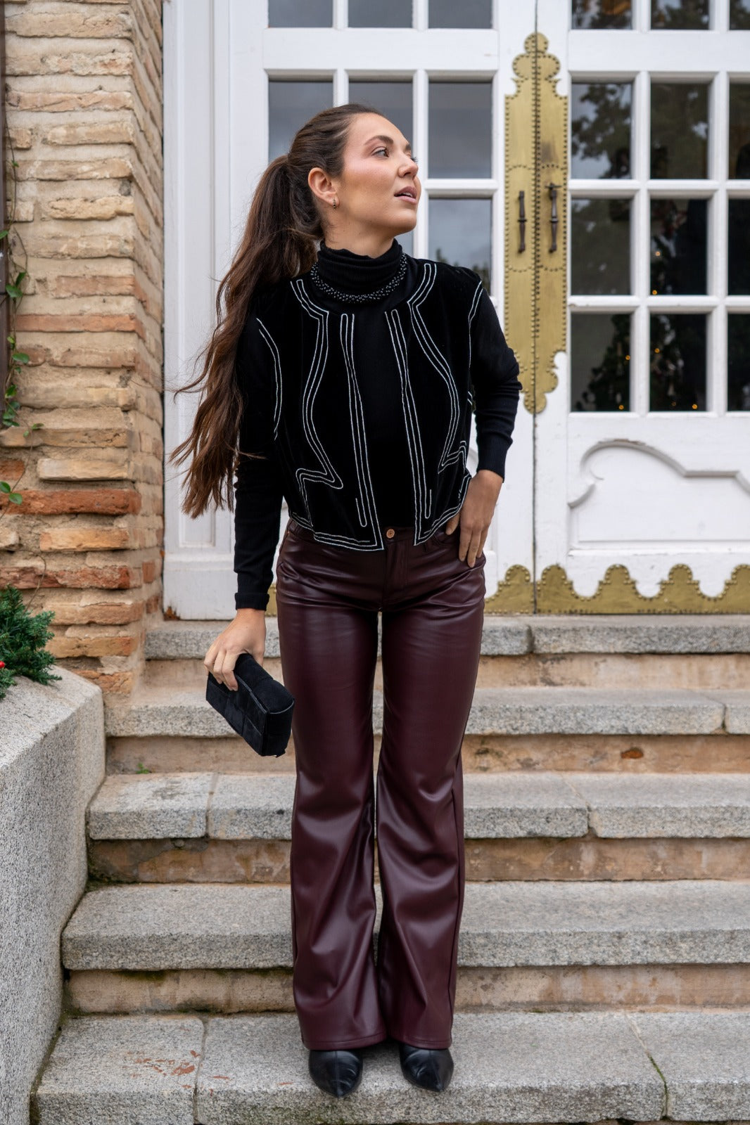 Pantalón vaquero tiro alto, bolsillos traseros y bolsillos delanteros, ancho, en poli piel burdeos.