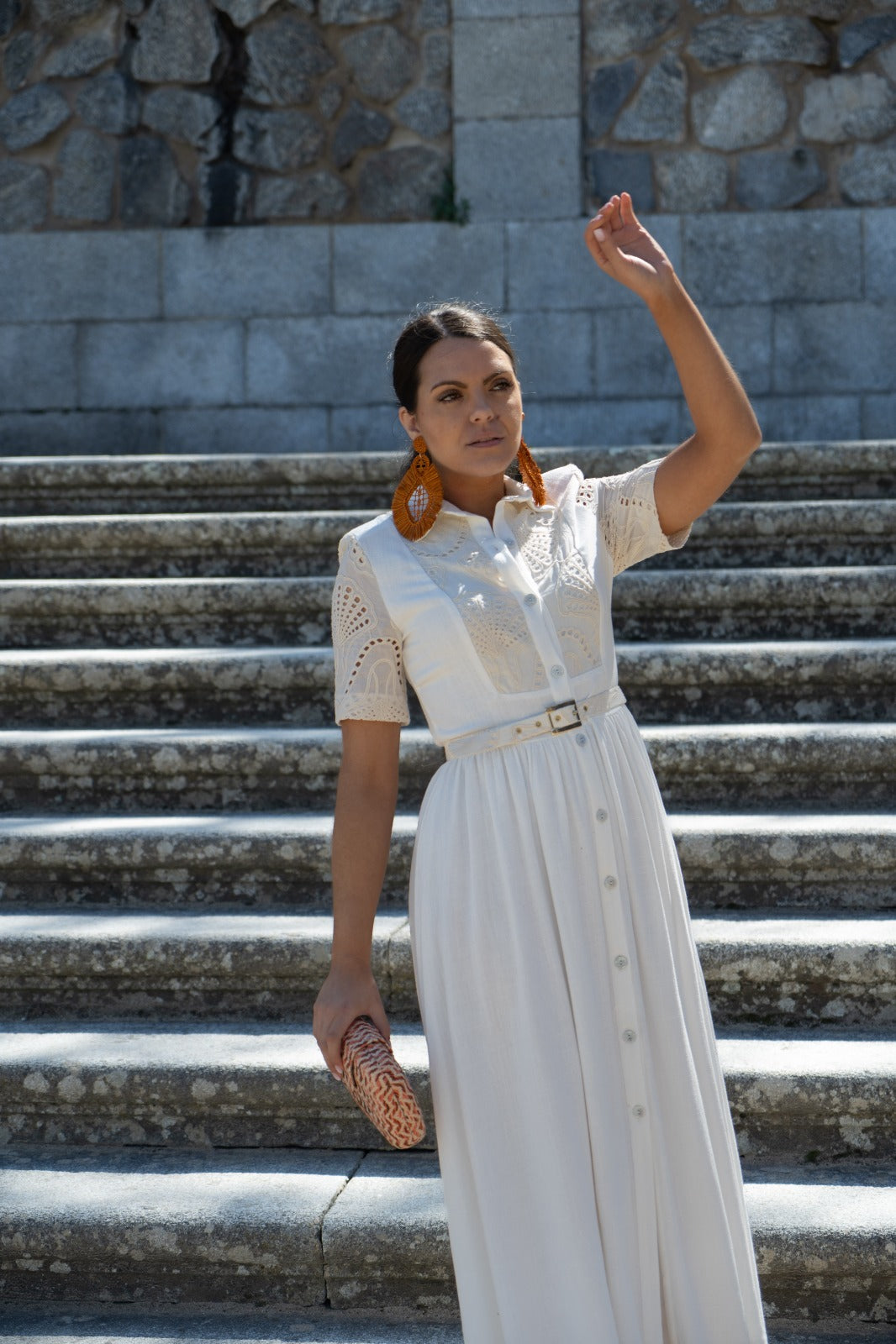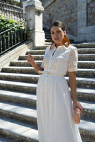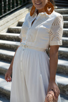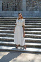 Vestido midi, escote cuello camisero, manga corta con detalles calados, abotonado, cinturon para ajustar en cintura. En color beige.