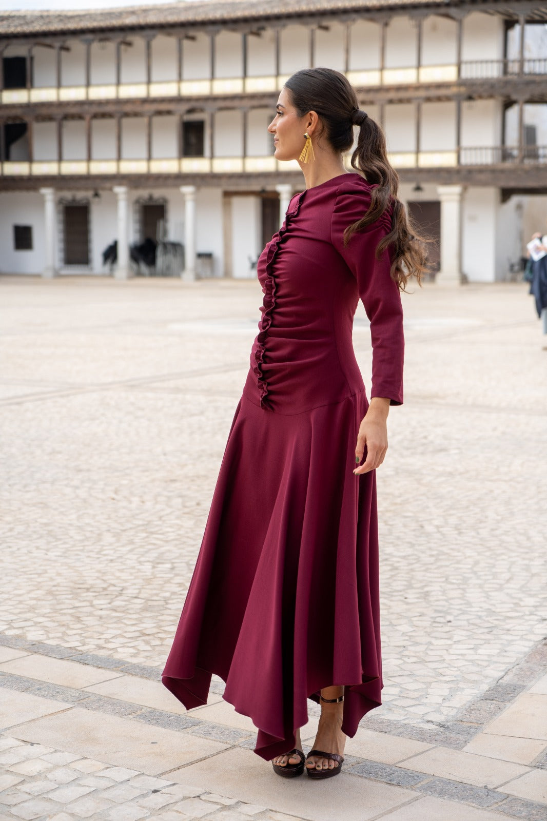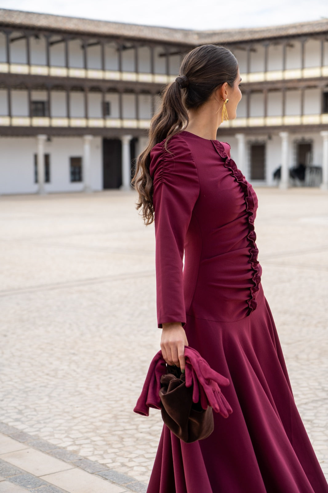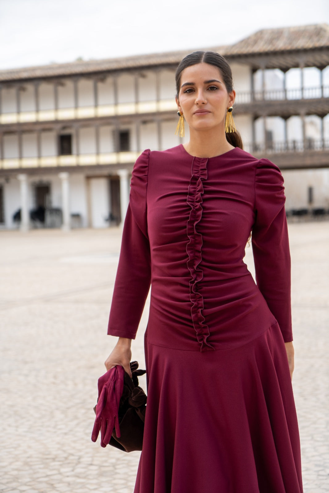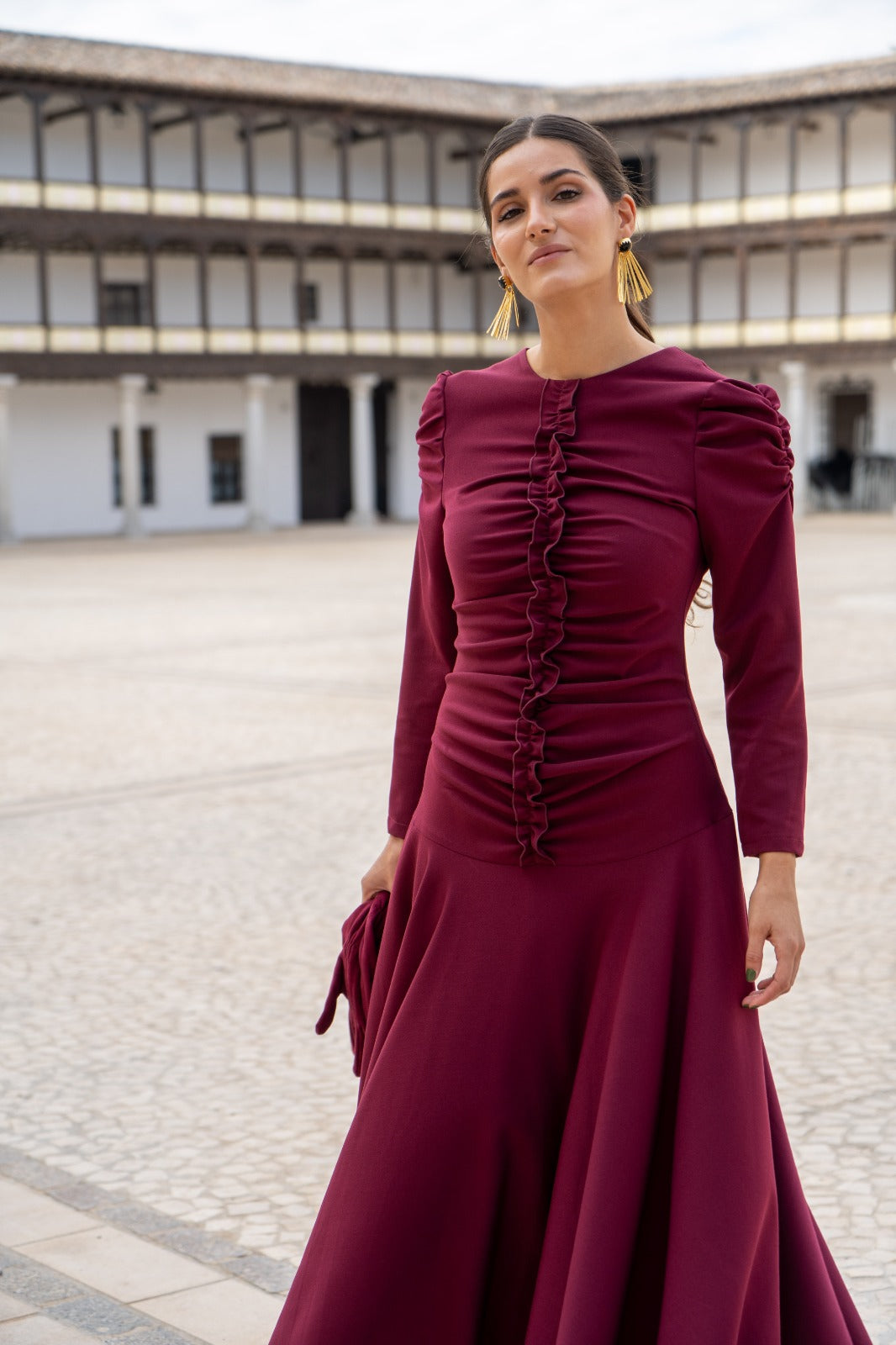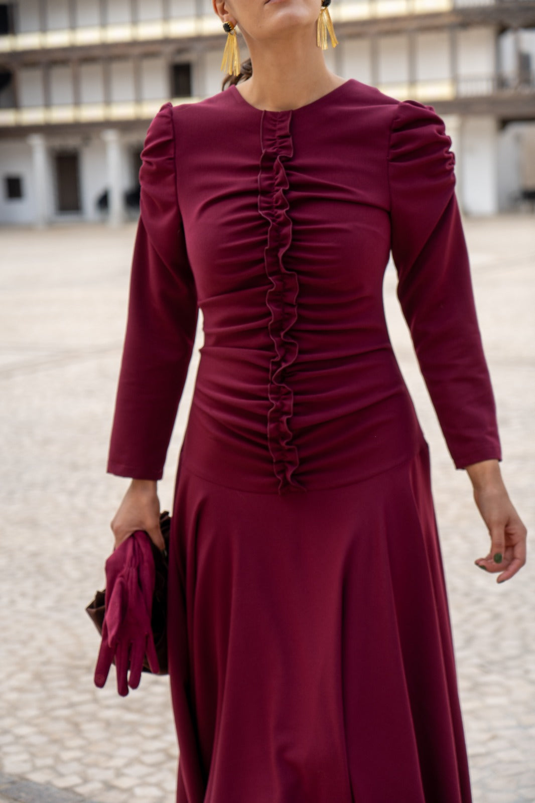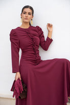 Vestido escote redondo, manga larga abullonada, detalle fruncido delantero, falda a picos. En color burdeos.