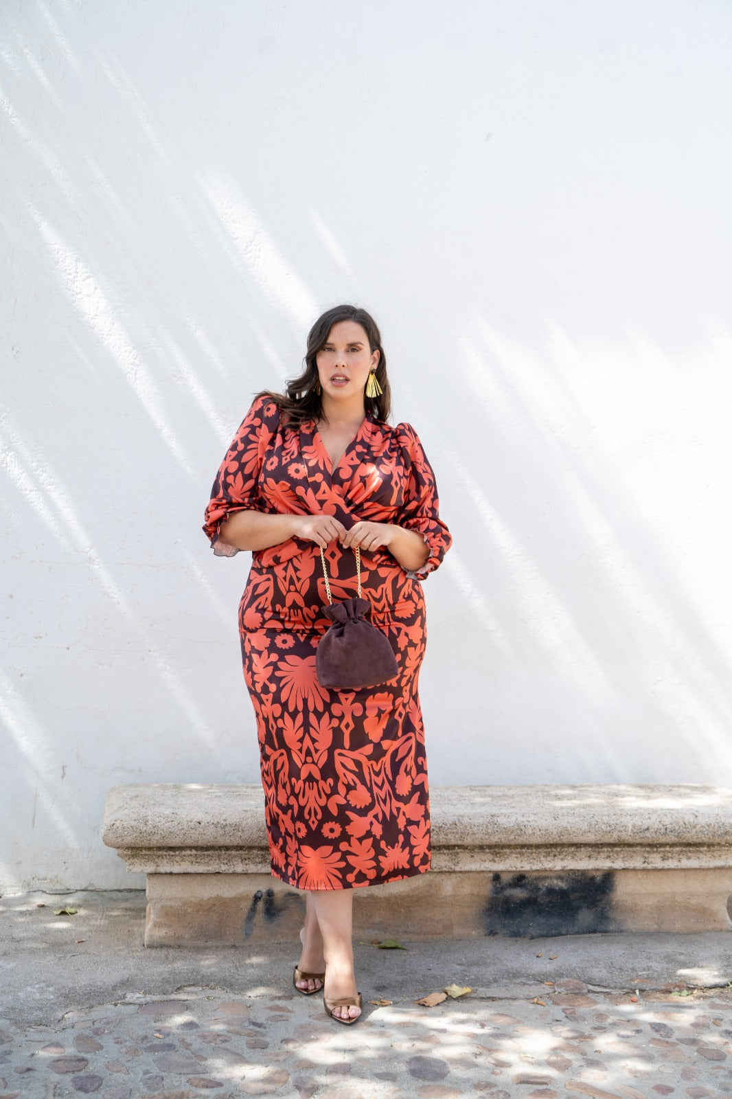 Vestido midi, escote cruzado, manga francesa con goma en puño, abertura delantera a un lado. Estampado marrón y teja.