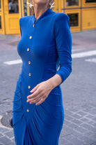 Vestido midi en punto seda, cuello subido, manga larga, detalle botones y frunce delantero, totalmente elastico. En color azul.