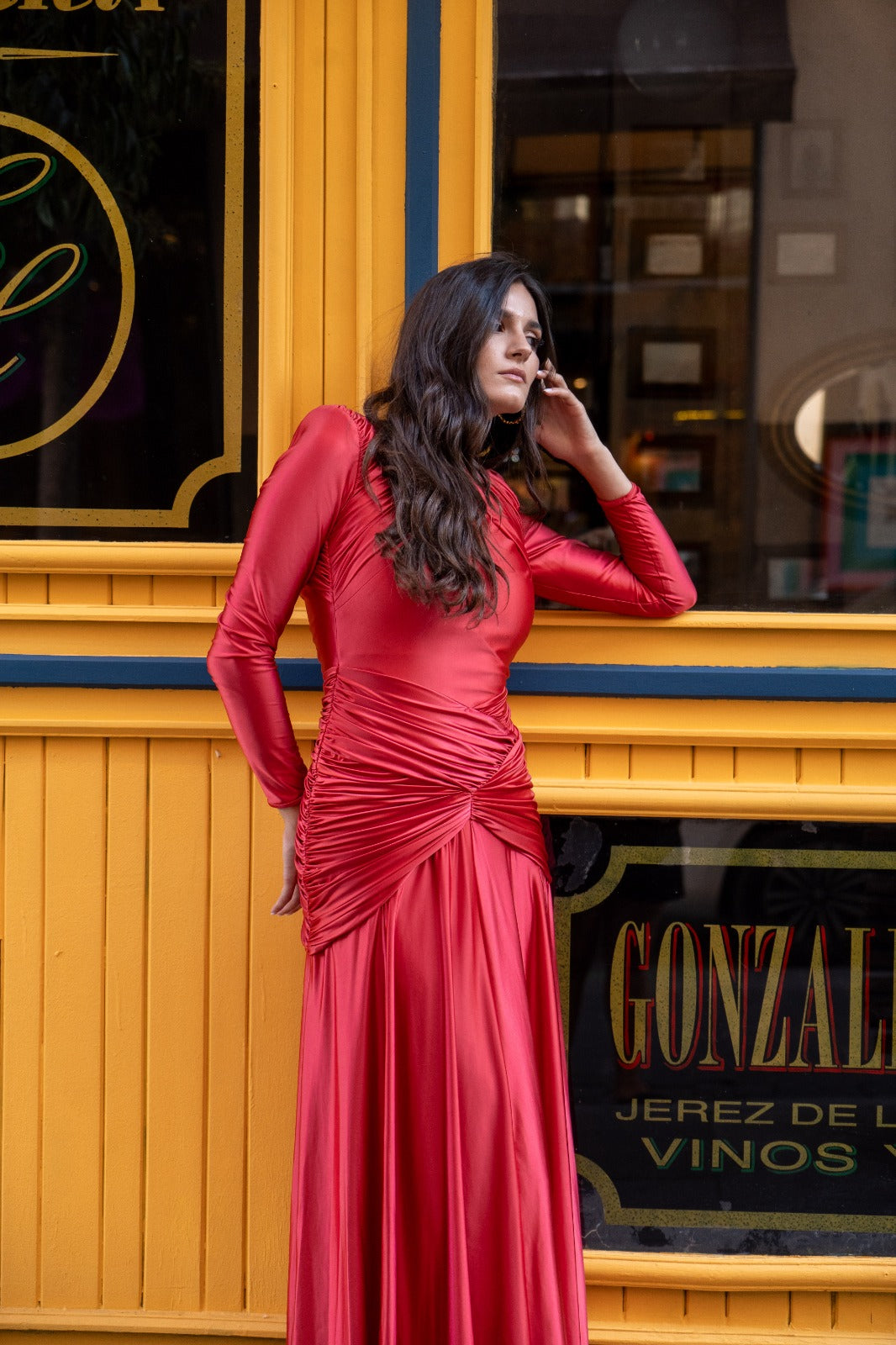 Vestido midi, escote redondo, escote trasero, manga larga, drapeado en diferentes direcciones que envuelven el cuerpo, parte de abajo en capa. En color rojo con efecto metalico.
