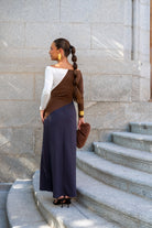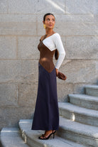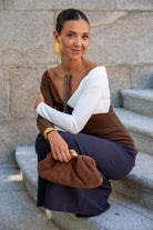 Vestido modo, escote bardot, manga larga, con vuelo. En punto tricolor marrón, blanco y gris.