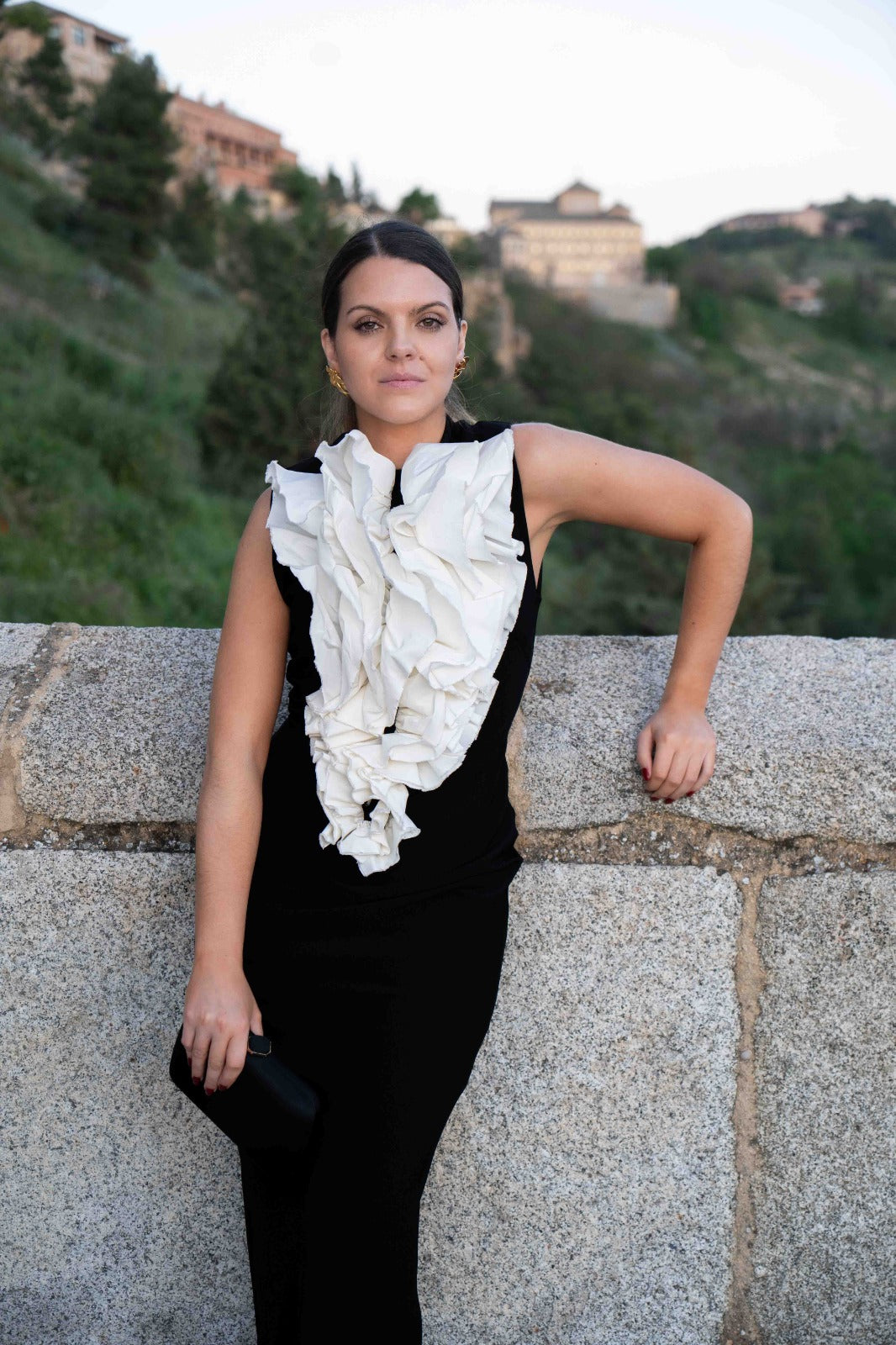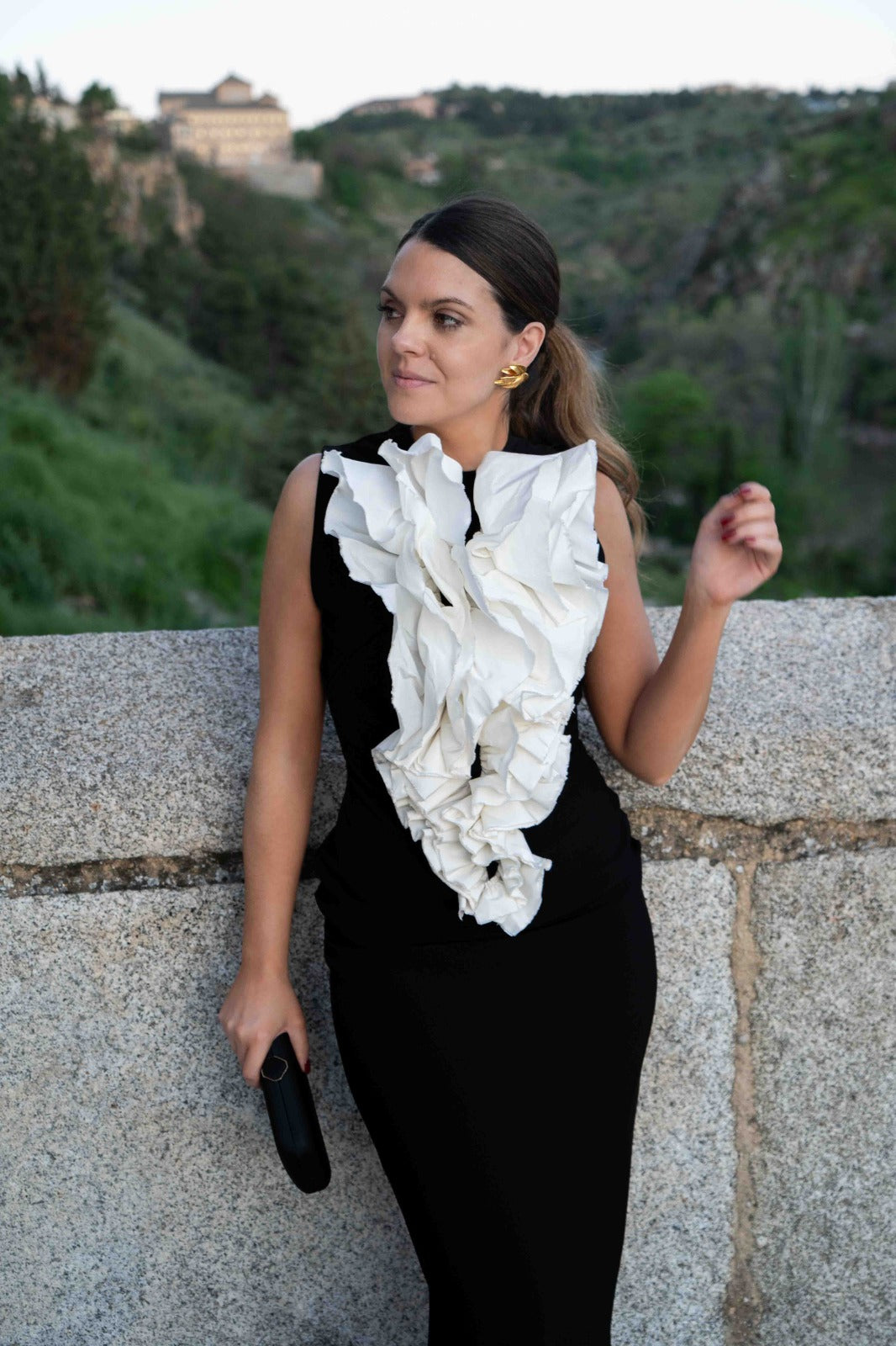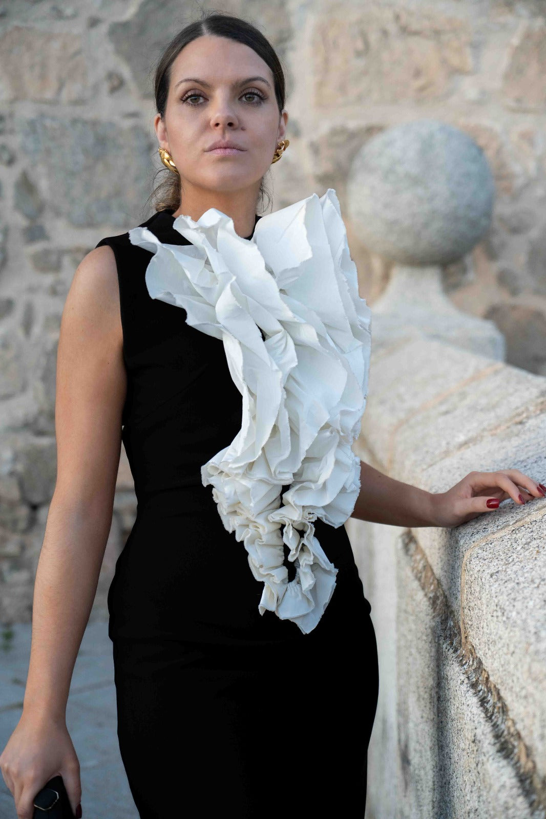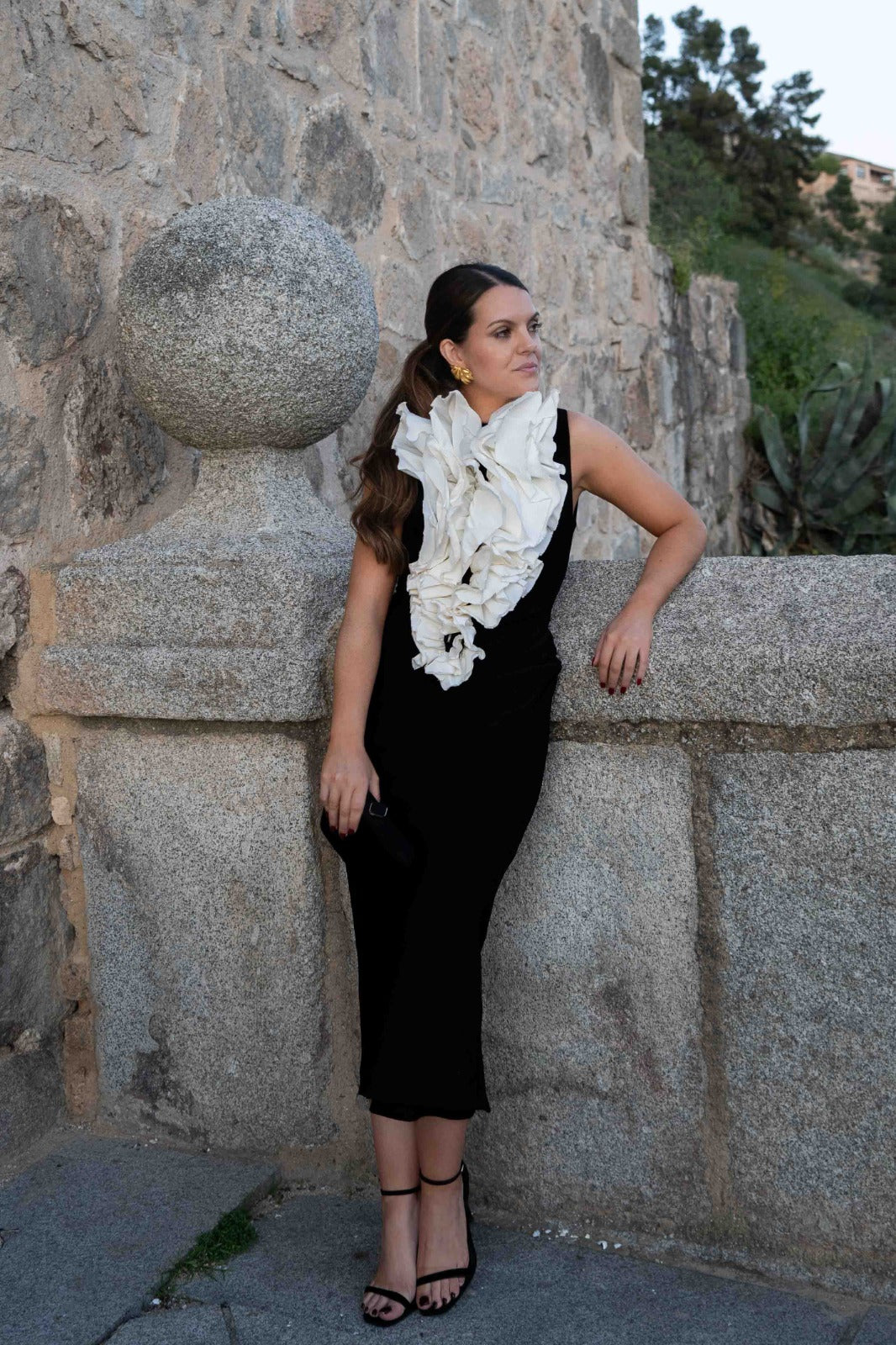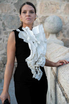 Vestido midi, escote redondo, con volante insipirado en claveles, sin mangas, abertura trasera. Bicolor negro y blanco.
