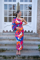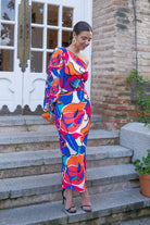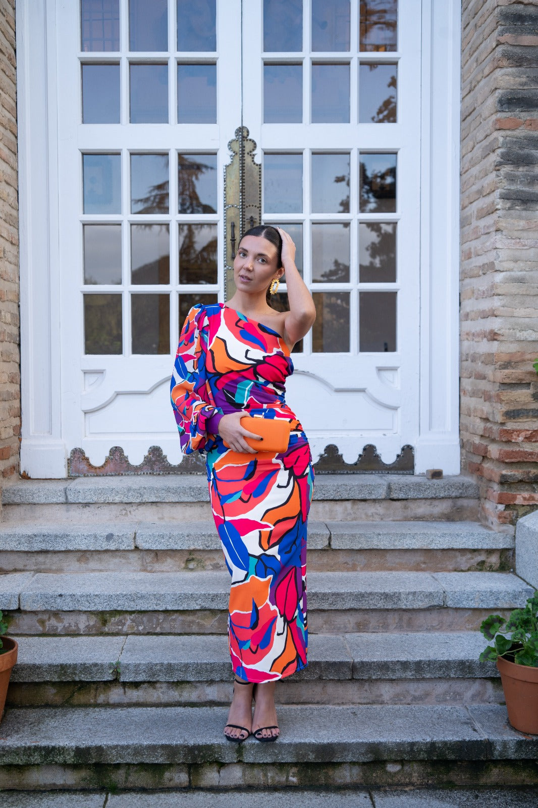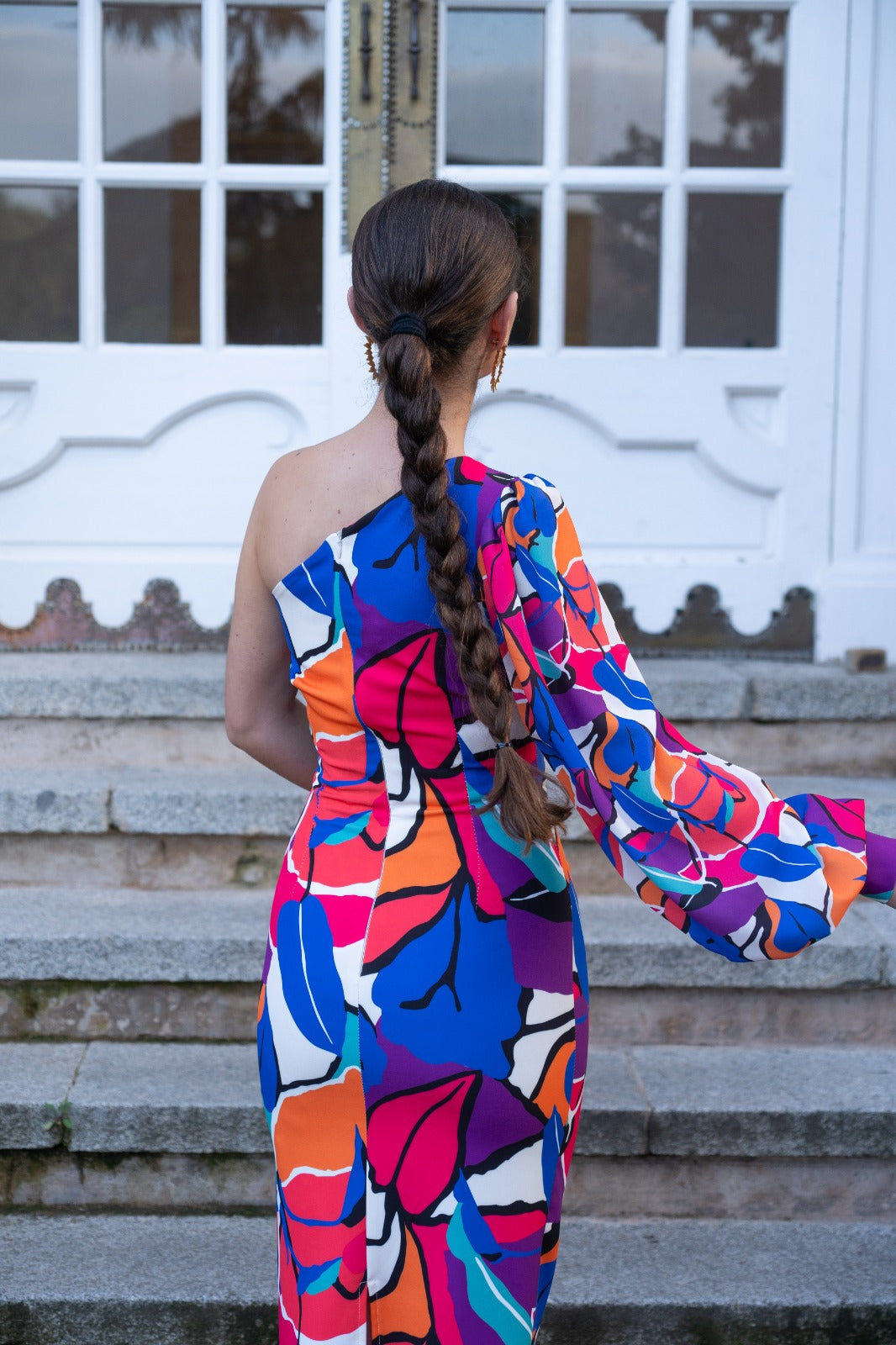 Vestido asimetrico en un lado y manga larga con puño en el otro, fruncido en cintura, abertura trasera. Estampado multicolor.