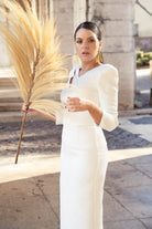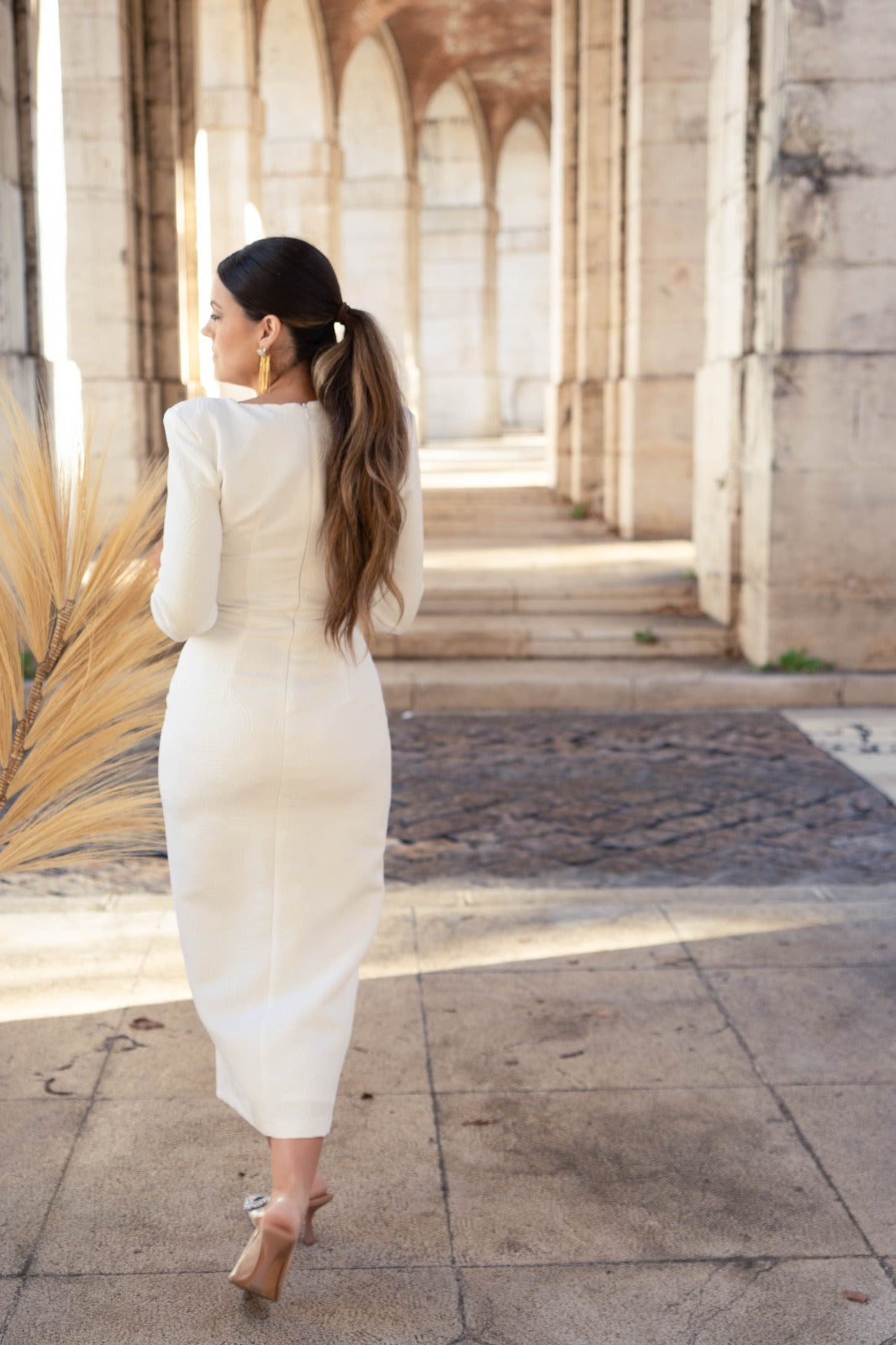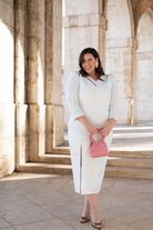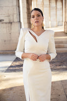 Vestido midi, escote a pico y pequeña abertura a un lado, manga francesa, abertura delantera a un lado. En color blanco con dibujo y detalla en lurex plata.