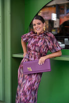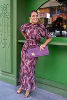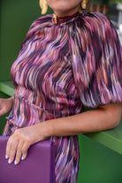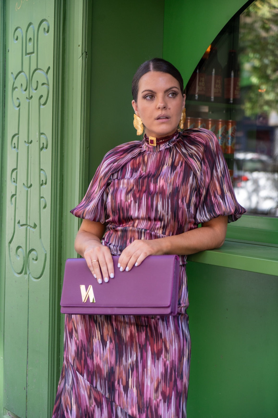 Vestido midi, cuello subido, escote trasero, manga corta abullonada, pequeño vilante abajo. En color estamapado con lurex.