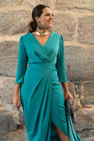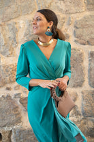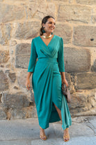 Vestido midi, escote cruzado, manga francesa, corte en cintura con pliegues y cinturón, abertura delantera a un lado. En color verde.