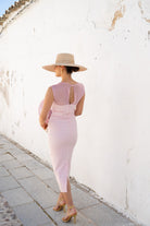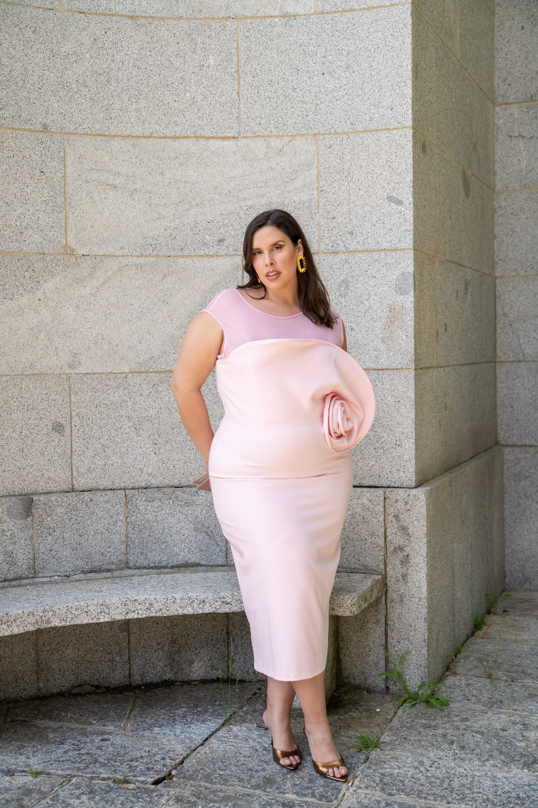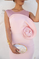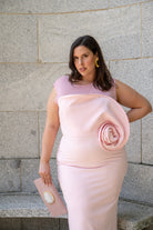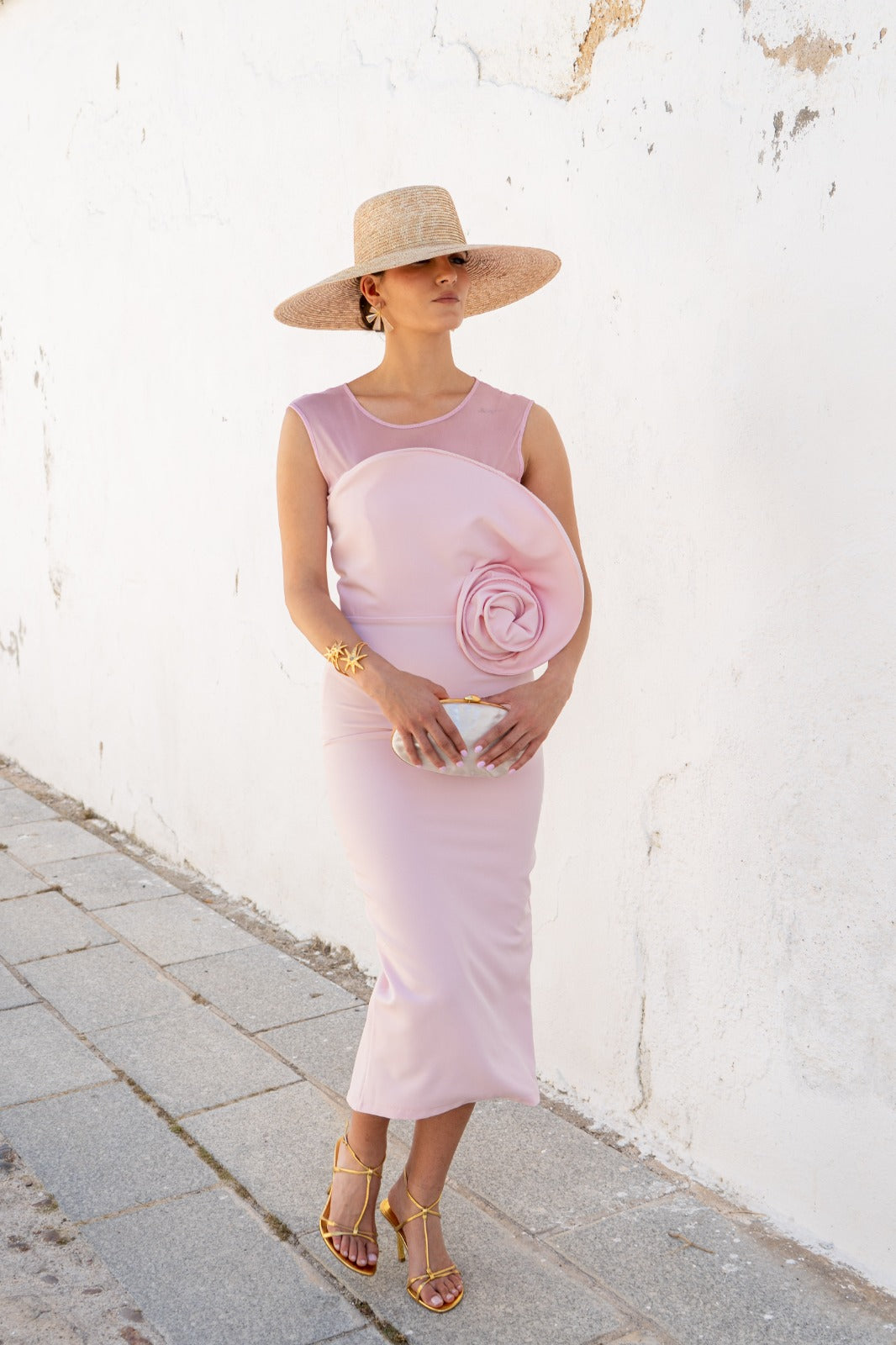 Vestido midi, escote redondo, sin mangas, parte de arriba en gasa, detalle flor a un lado, abertura trasera. En color rosa.