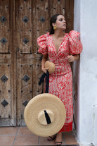 Vestido escote a pico terminado en nudo, manga corta abullonada, detalle flecos en el bajo. Bicolor estampado beige y naranja.