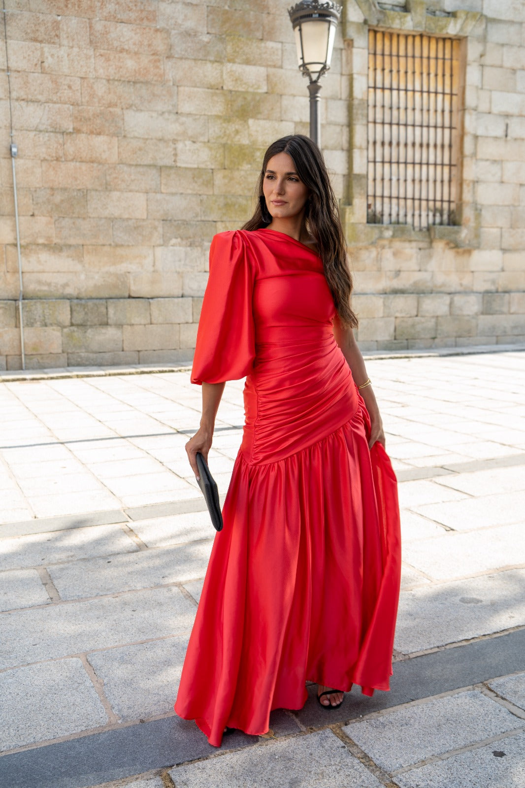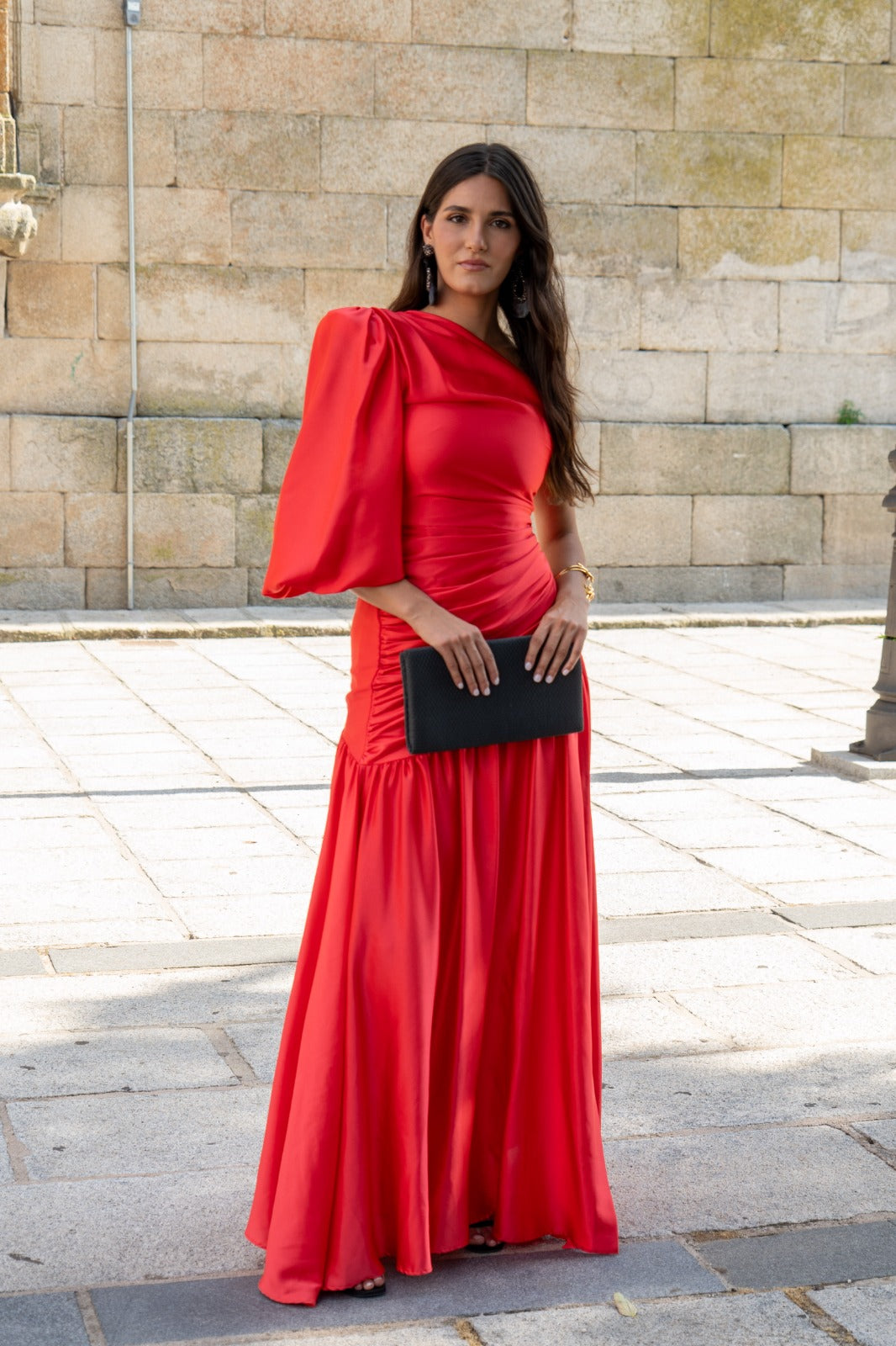Vestido largo, asimetrico en un lado y manga farol en otro, drapeado, volante abajo. En saten rojo.