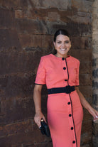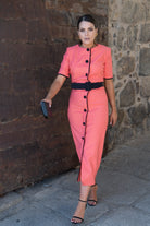 Vestido midi, escote redondo, manga corta, detalle botones negros, cinturon incluido, abertura delantera. En color coral combinado con negro.