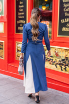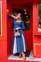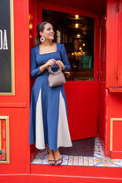 Vestido midi, escote cuadrado, manga francesa, cinturón incluido, falda con vuelo. bicolor azul y beige.
