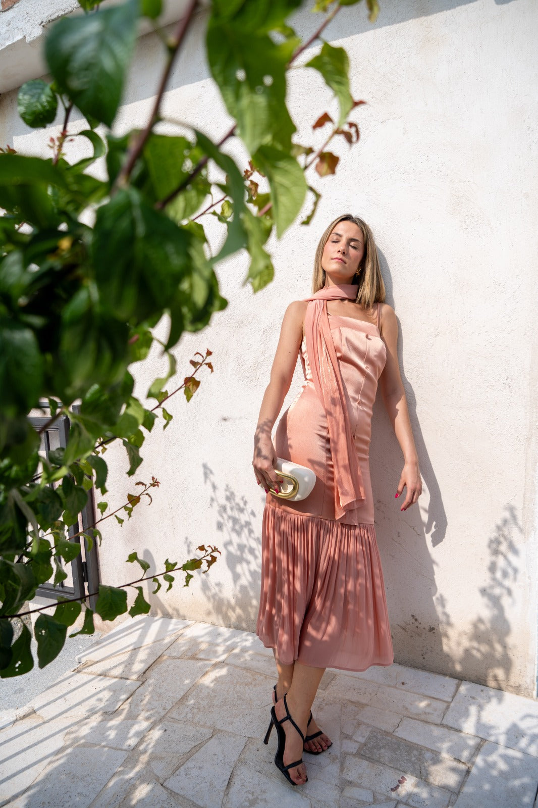 Vestido midi, hombrera fina, escote cuadrado, botones delanteros, volante plisado abajo, fular incluido. En color coral.