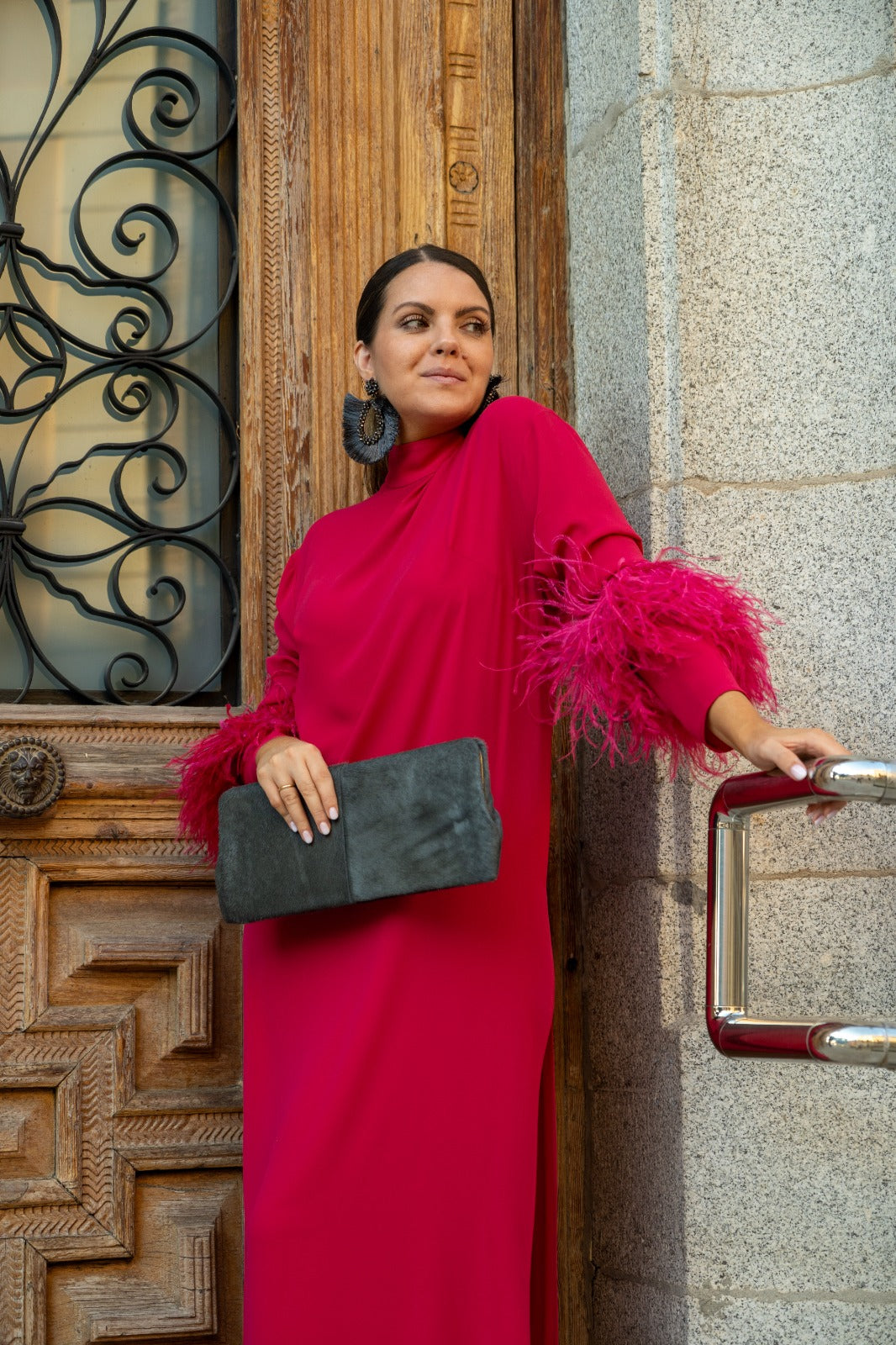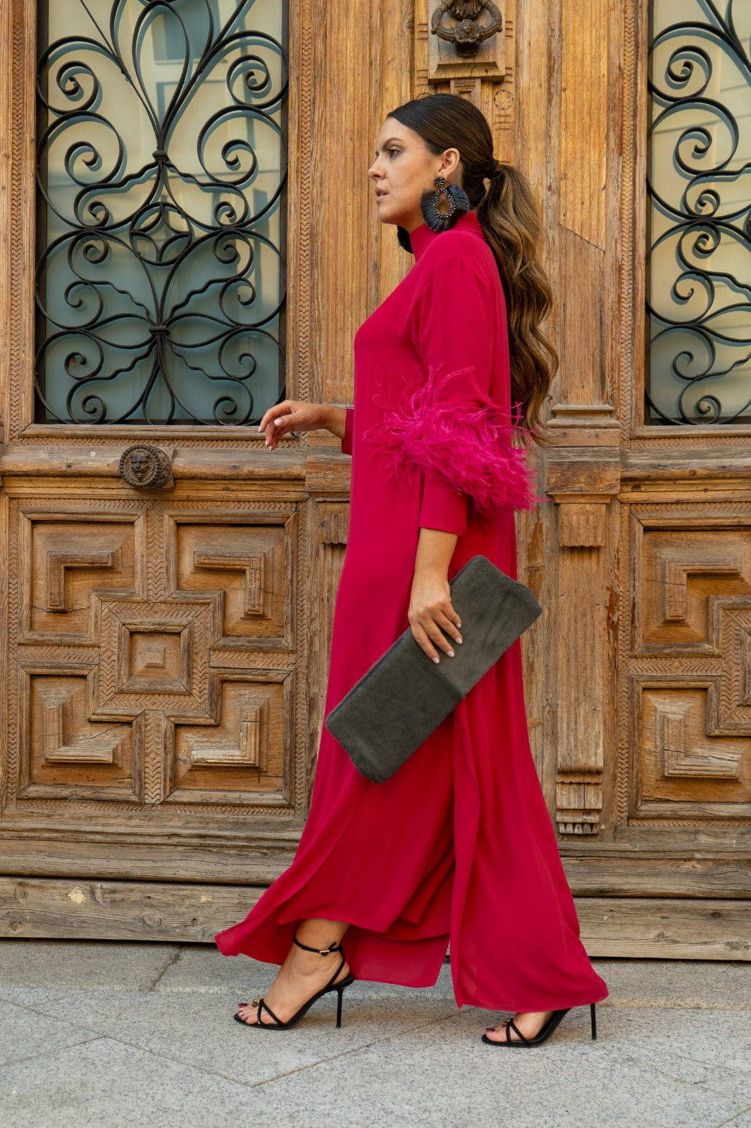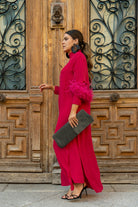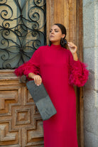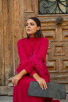 Vestido lencero de hombreras con kaftan encima, cuello tirilla, manga larga con detalle plumas ave a mitad del brazo, abertura lateral. En color frambuesa.