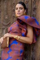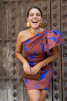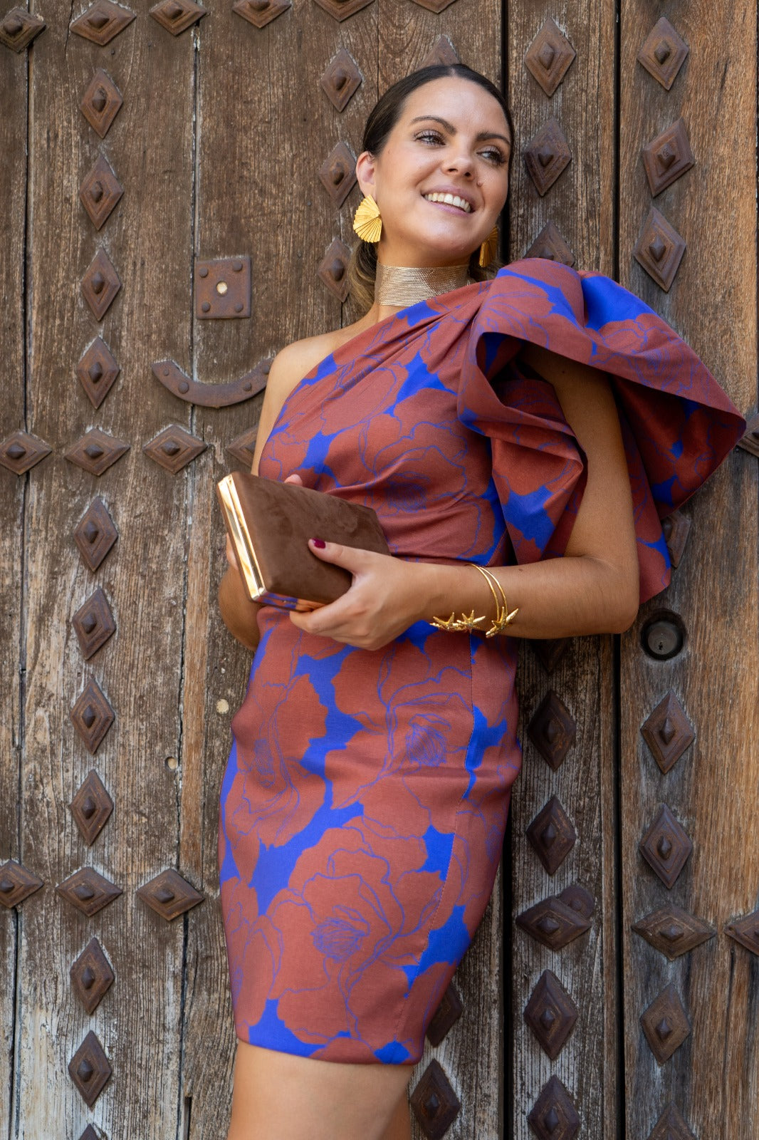 Vestido corto, asimétrico, con maxi volante, corte en cintura. En tafetán marrón con estampado.