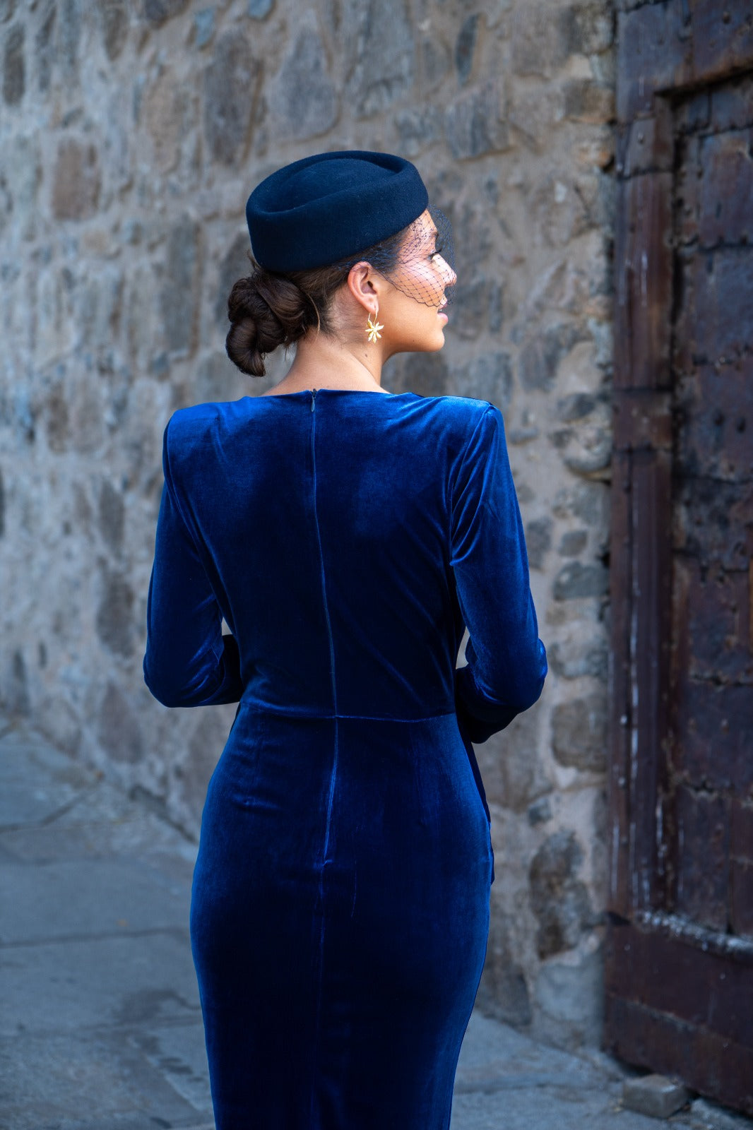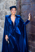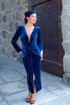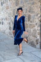 Vestido midi, escote a pico con tela transparente, manga larga, nudo en cintura, abertura delantera. En terciopelo azul. Ideal para combinar con nuestra capa ZAMIA.
