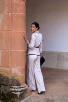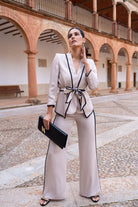 Conjunto compuesto por chaqueta cruzada cerrada con cinturón y pantalón tiro alto ancho. En color beige con vivos en color negro.