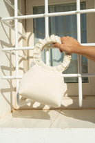 Bag with a round curly handle, lined in natural silk, in beige.