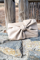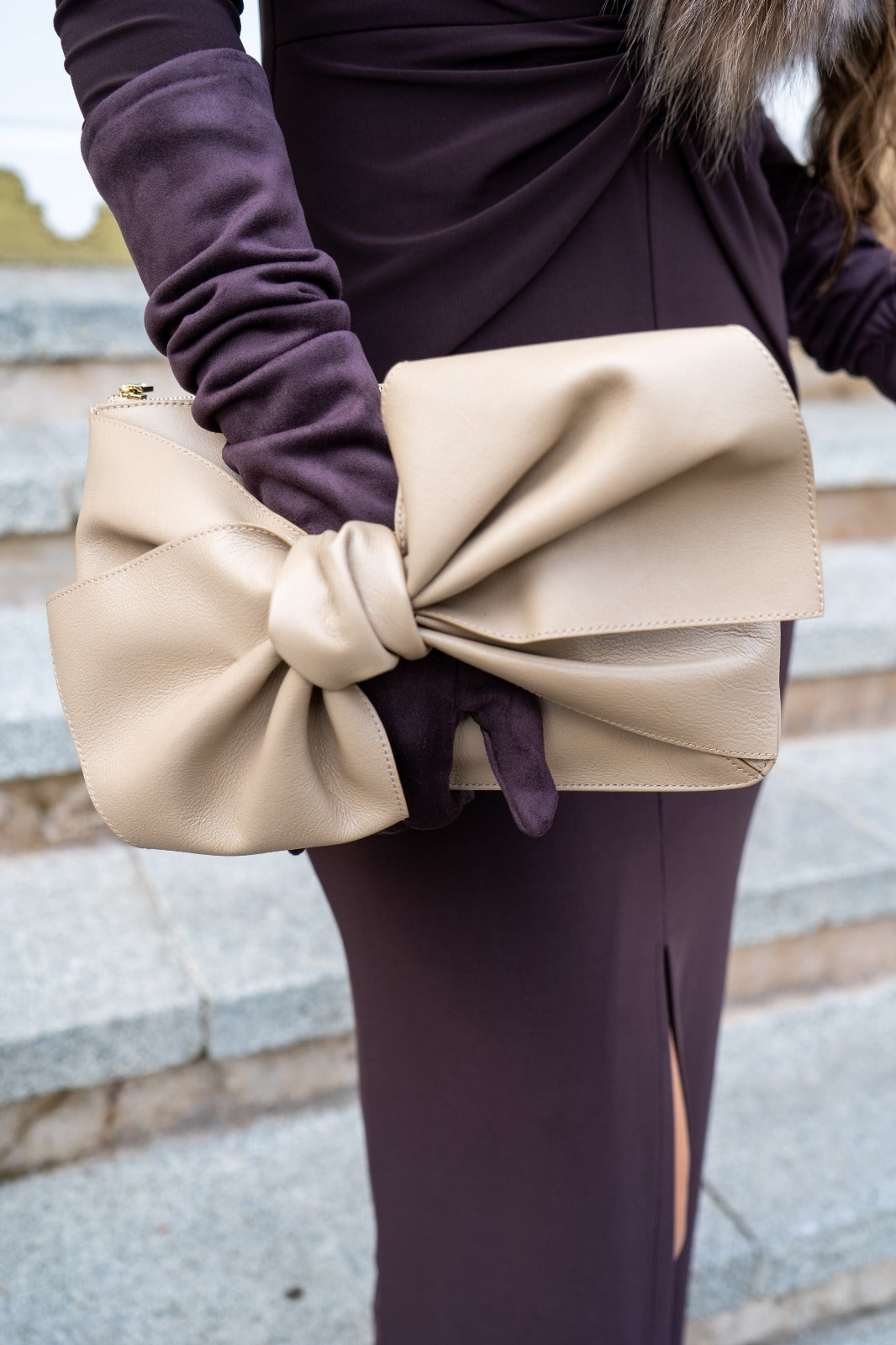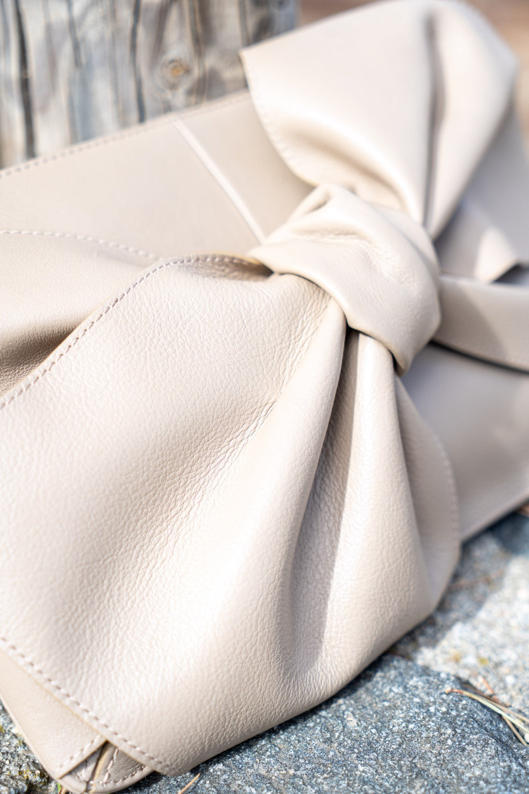 Leather drawstring bag shaped like a satchel or can be worn on the hip. Zip closure.