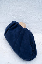 Oval wallet, soft fabric, gold-tone clasp, and chain. In blue.