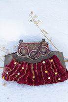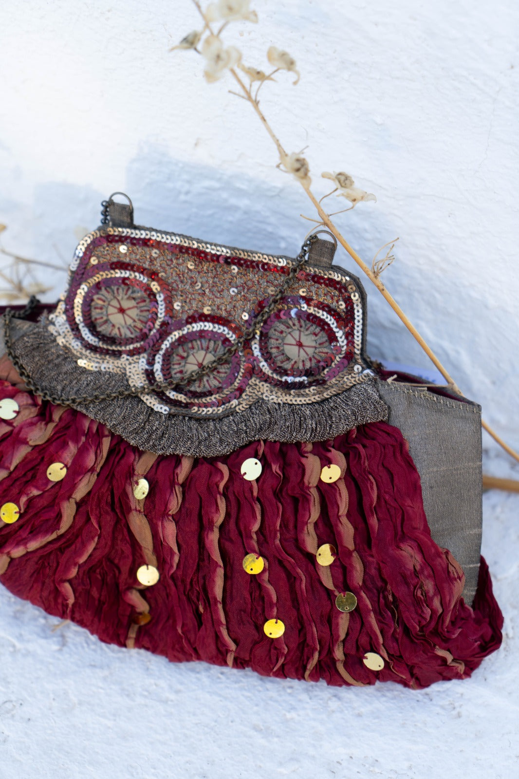 Burgundy fabric bag, gold sequin detail, short gold chain.