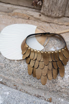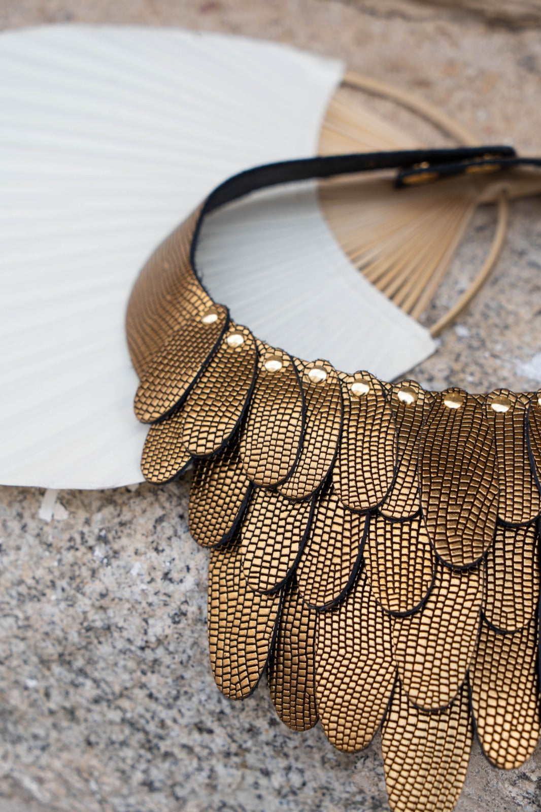 Leather pendant, made up of several pieces of embossed metallic leather. In gold color.