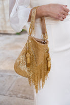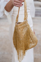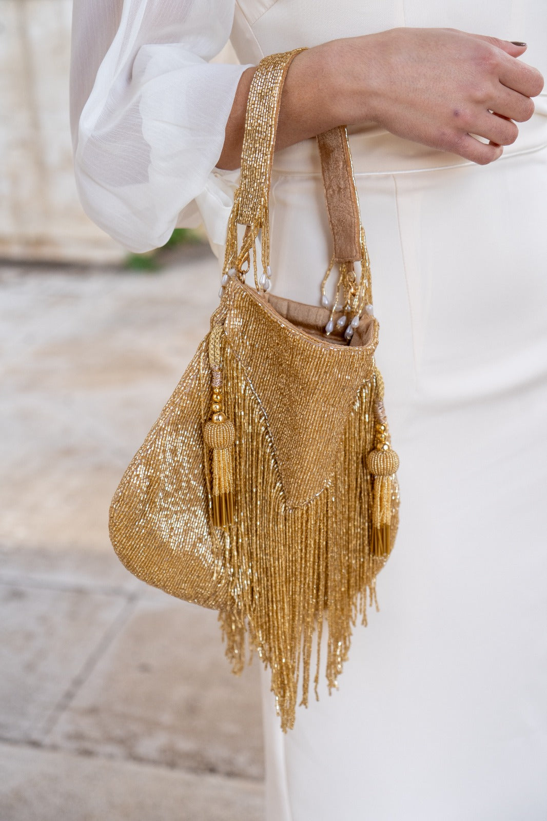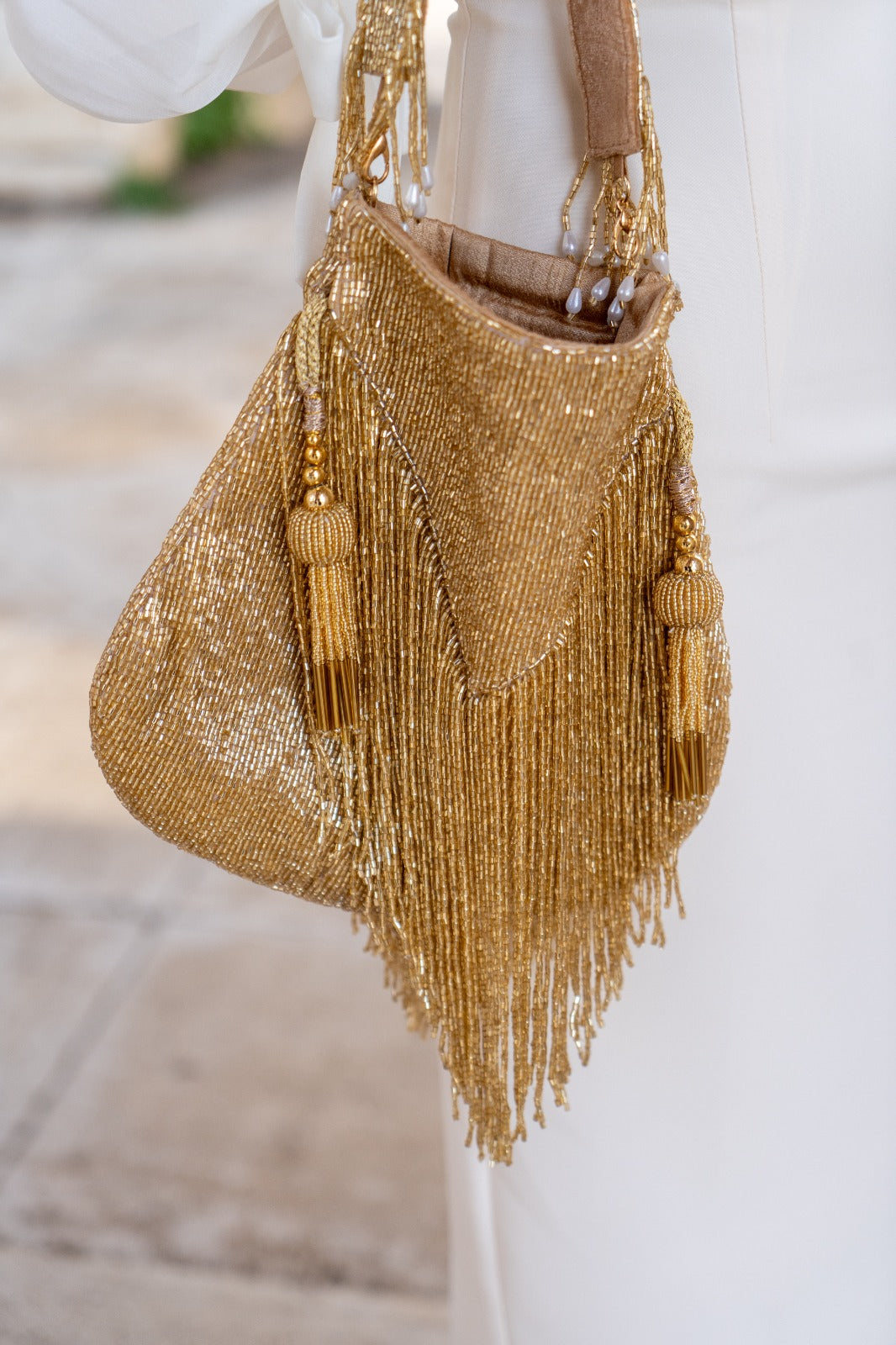 Golden candy dish, made of beads, short handle, the same on the front and back.