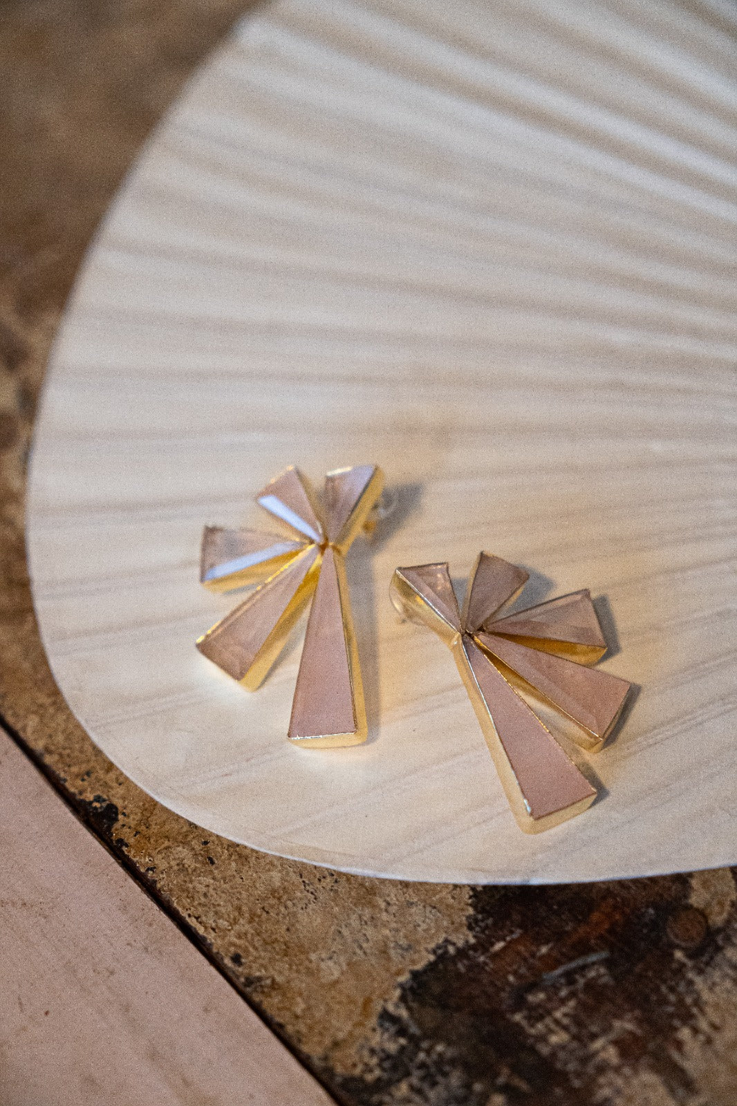Earrings made of five natural rose quartz stones in the shape of triangles of varying sizes, joined in the center. Handcrafted.