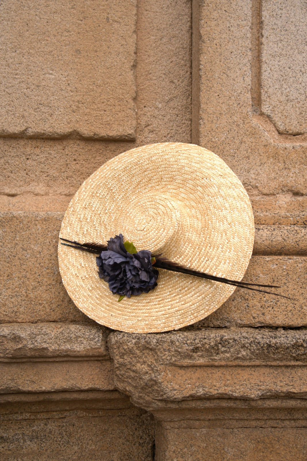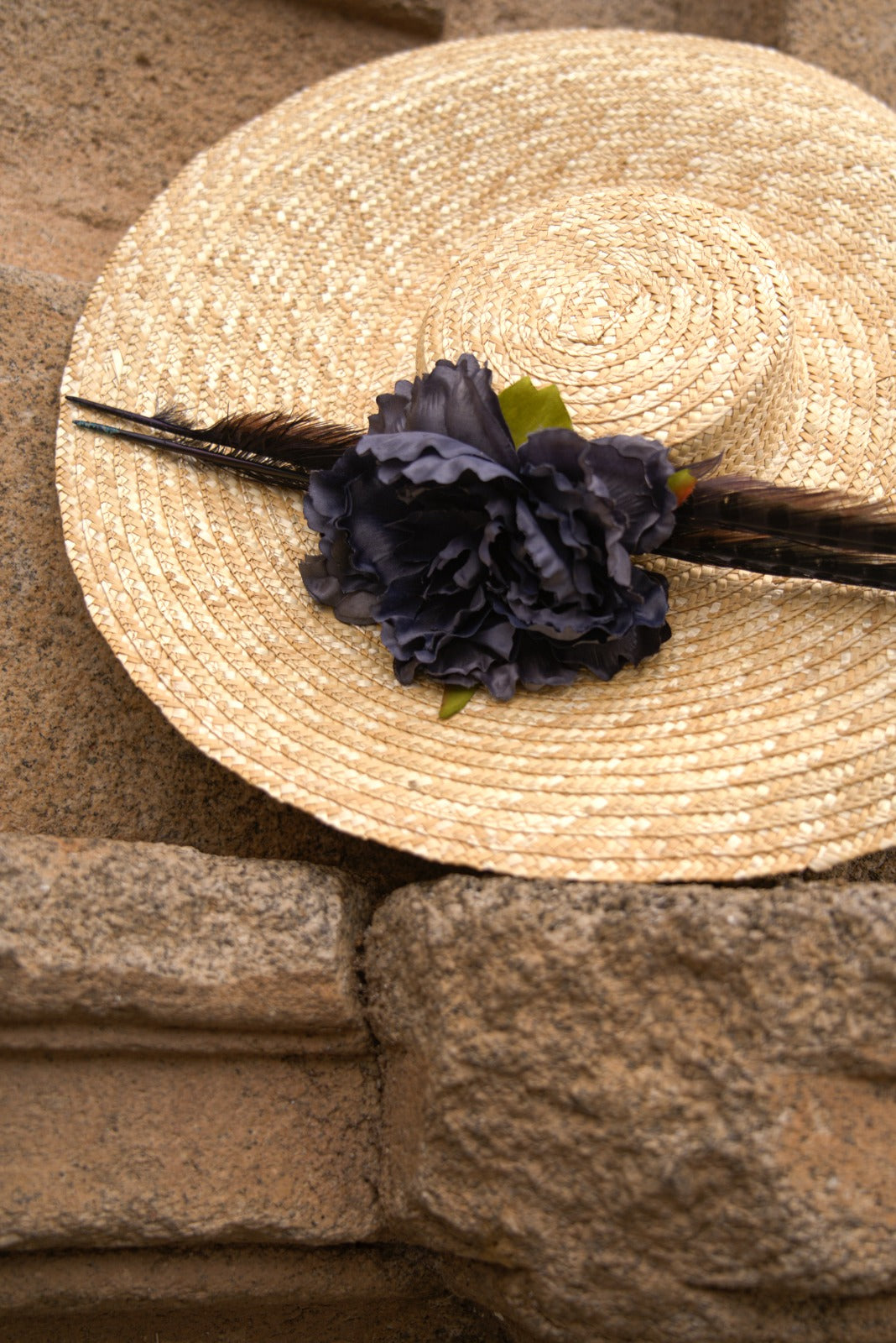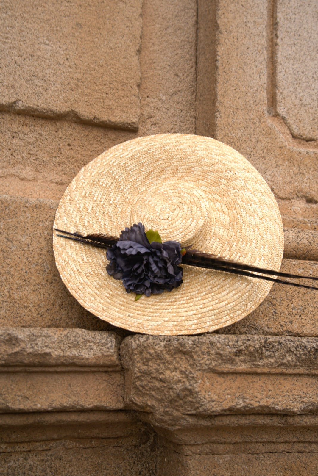 Natural straw hat, handmade with blue peony flowers and feathers.