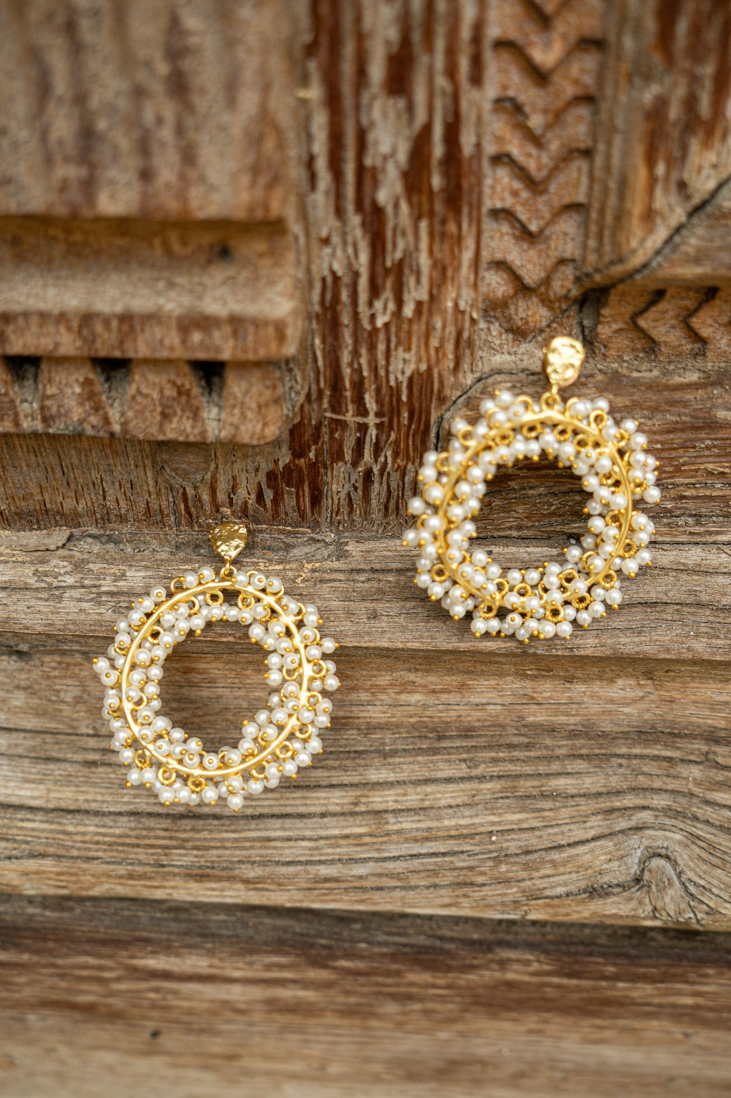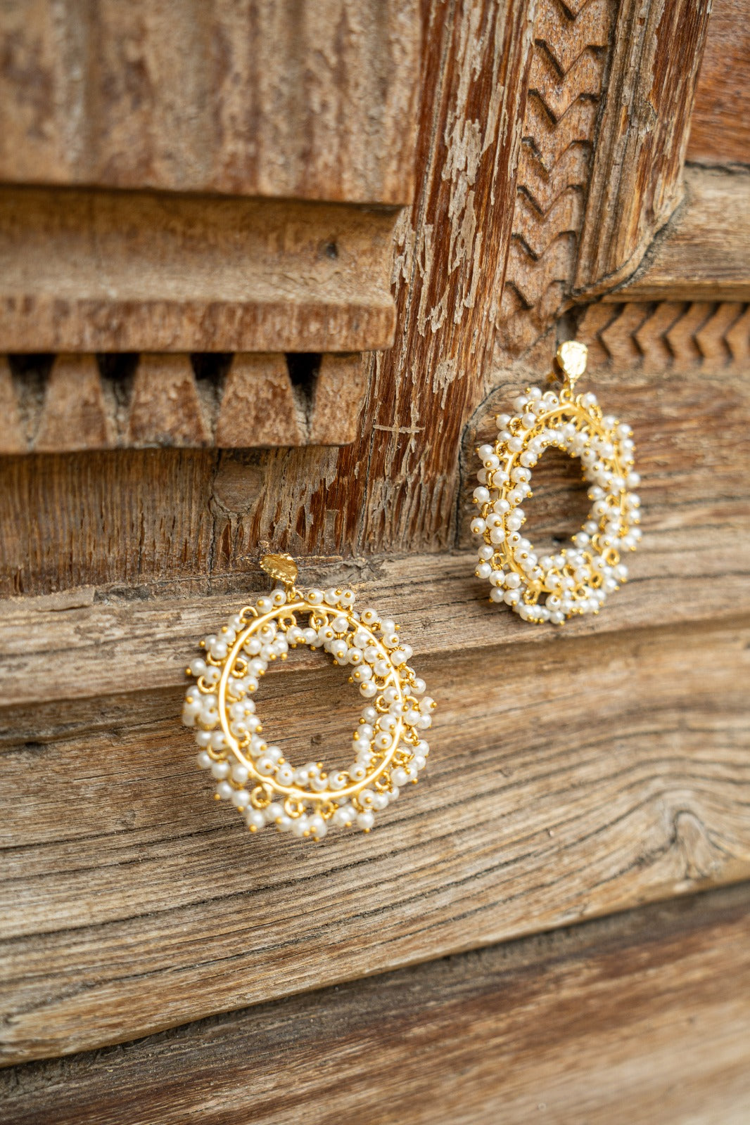 - Material: Gold-plated brass with pearls.