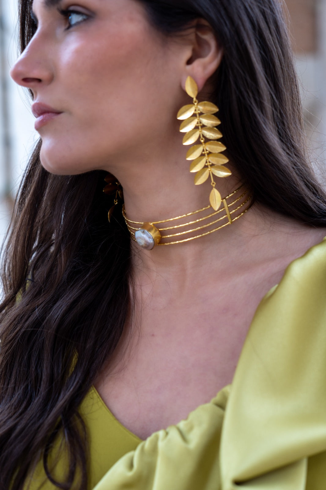 Long earrings made up of multiple handcrafted leaves, nut closure, gold plated.