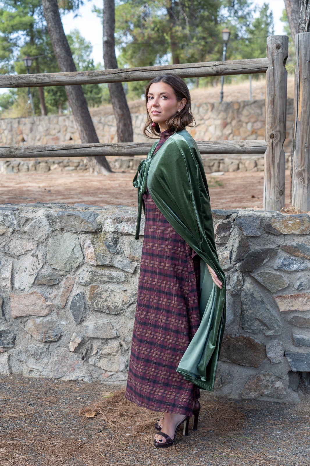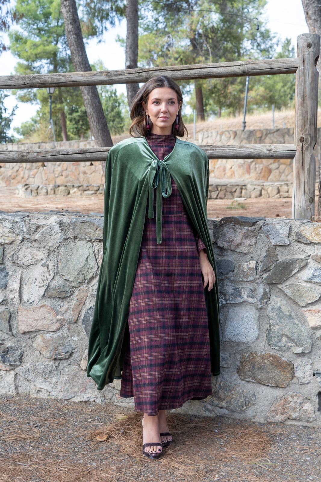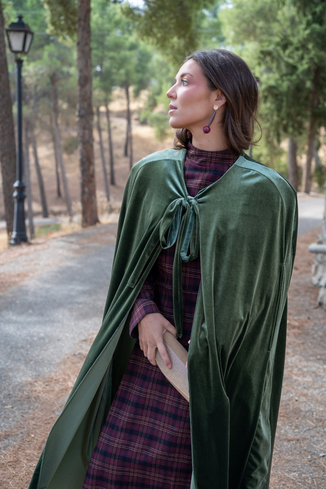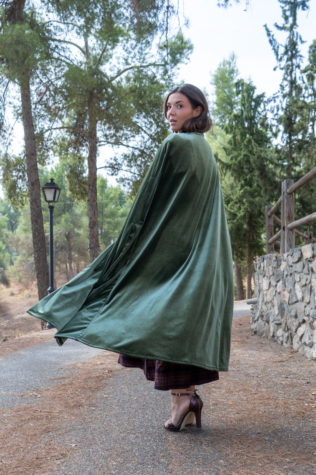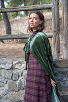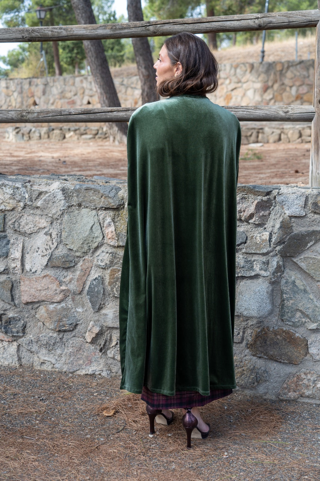 Velvet cape, with openings for the hands, approximately 120cm long, with a tie to fasten at the neck. In green.