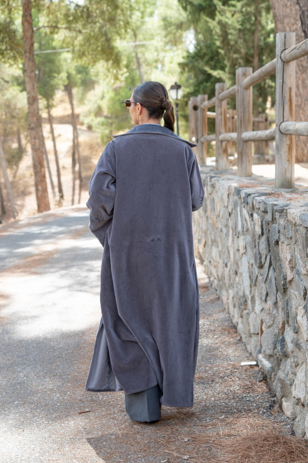 Straight kaftan with side slits, long sleeves, front pockets, and embroidered details. Made of gray velvet.