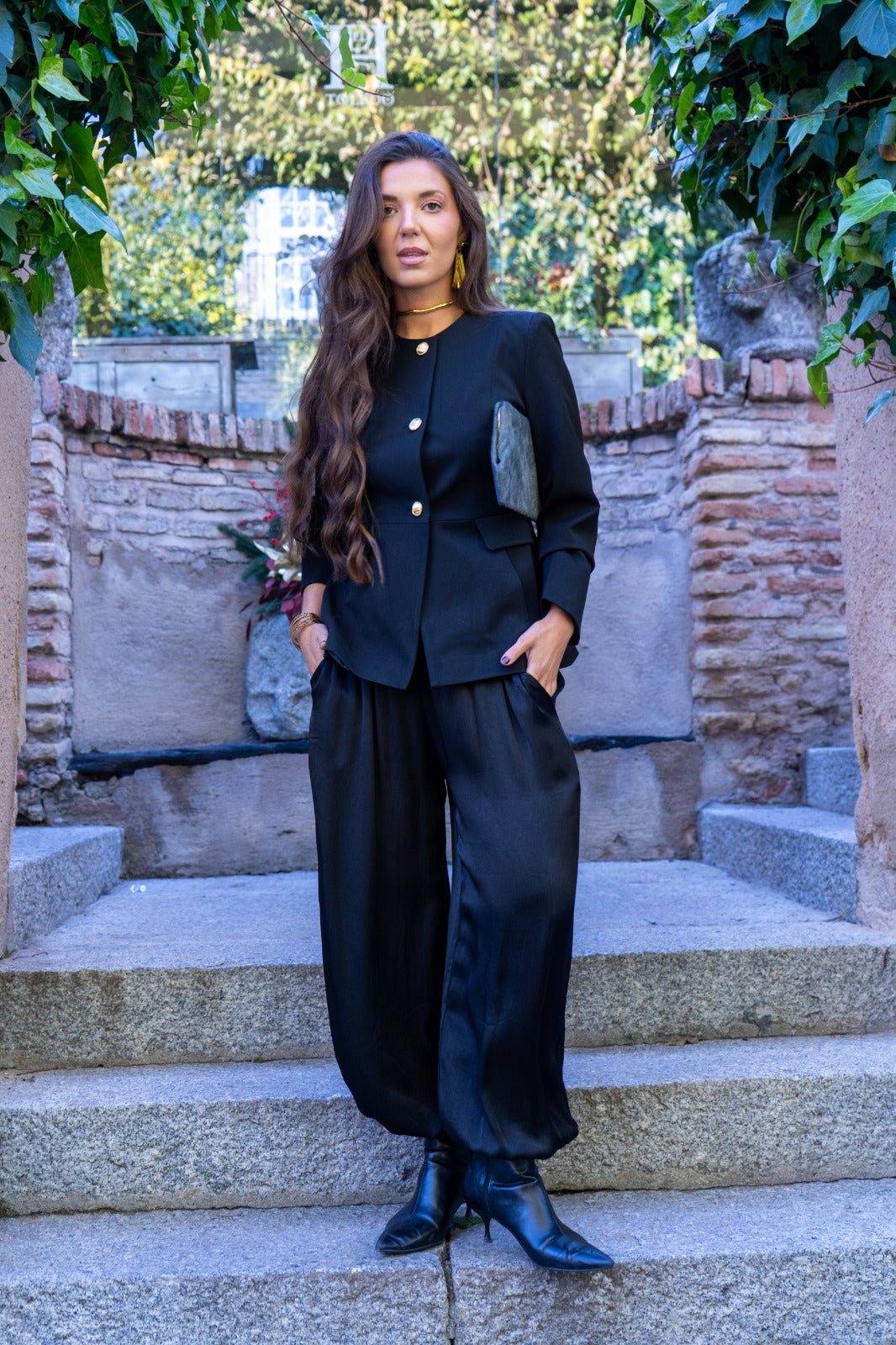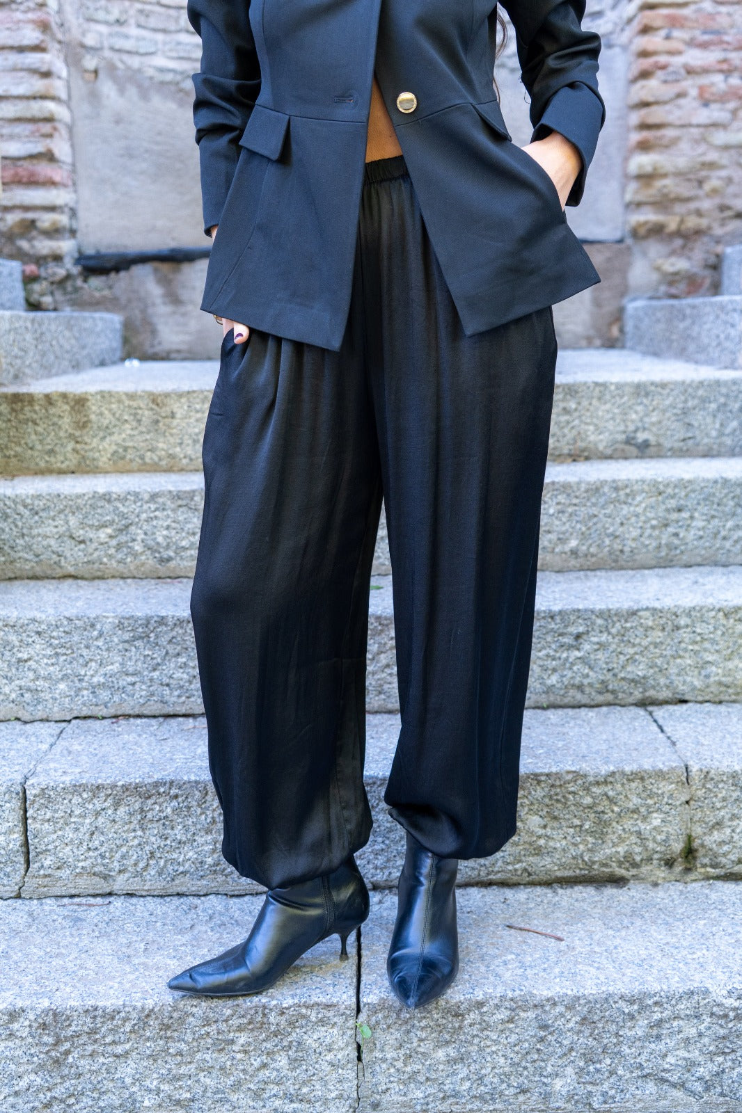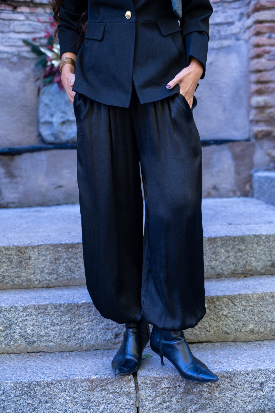 Pantalón bombacho, goma en cintura, bolsillos laterales, goma en el bajo. En tejido satinado negro.
