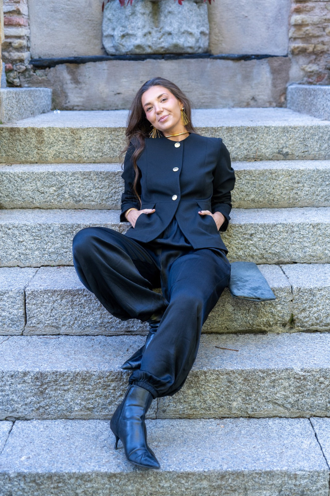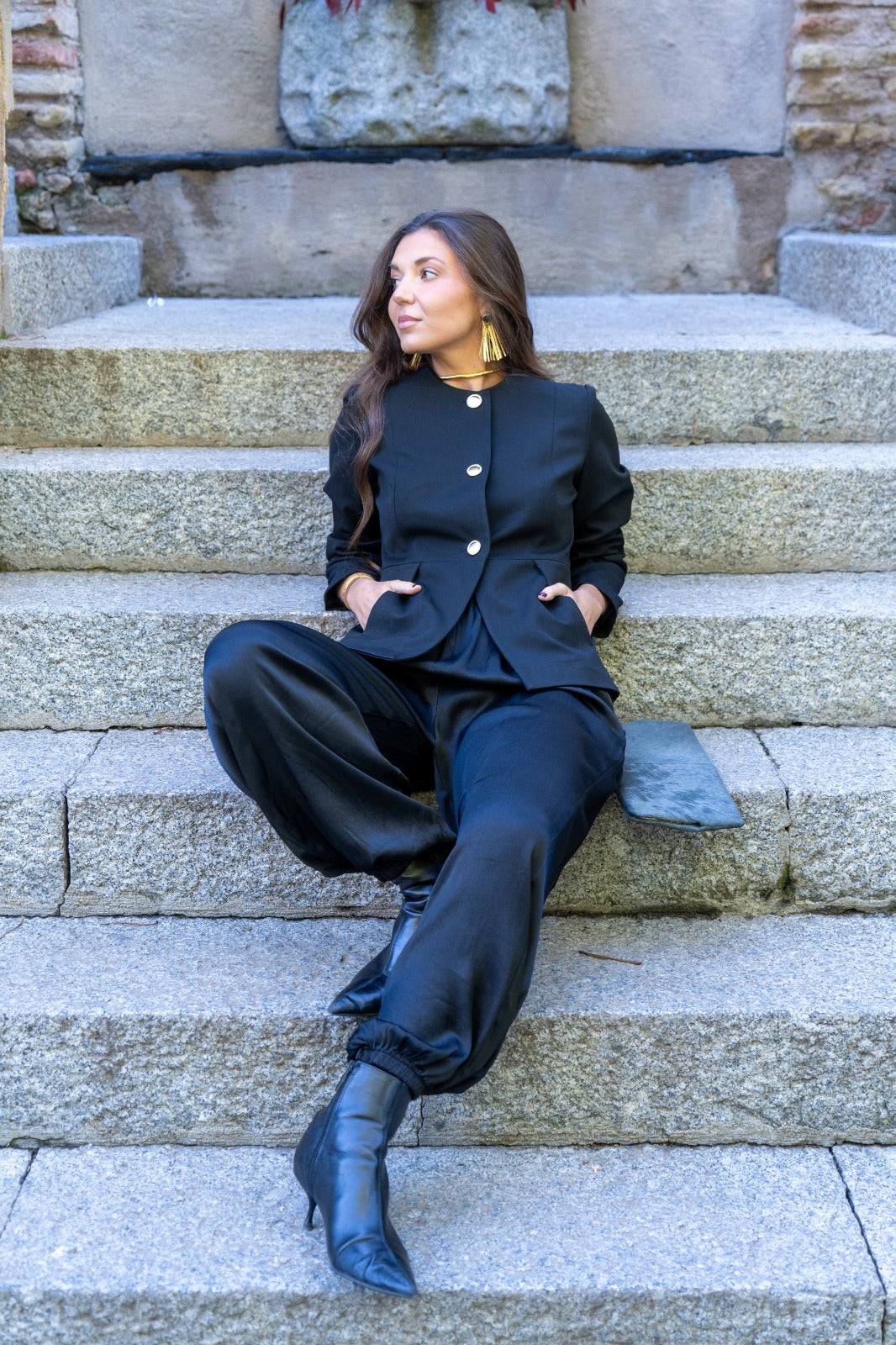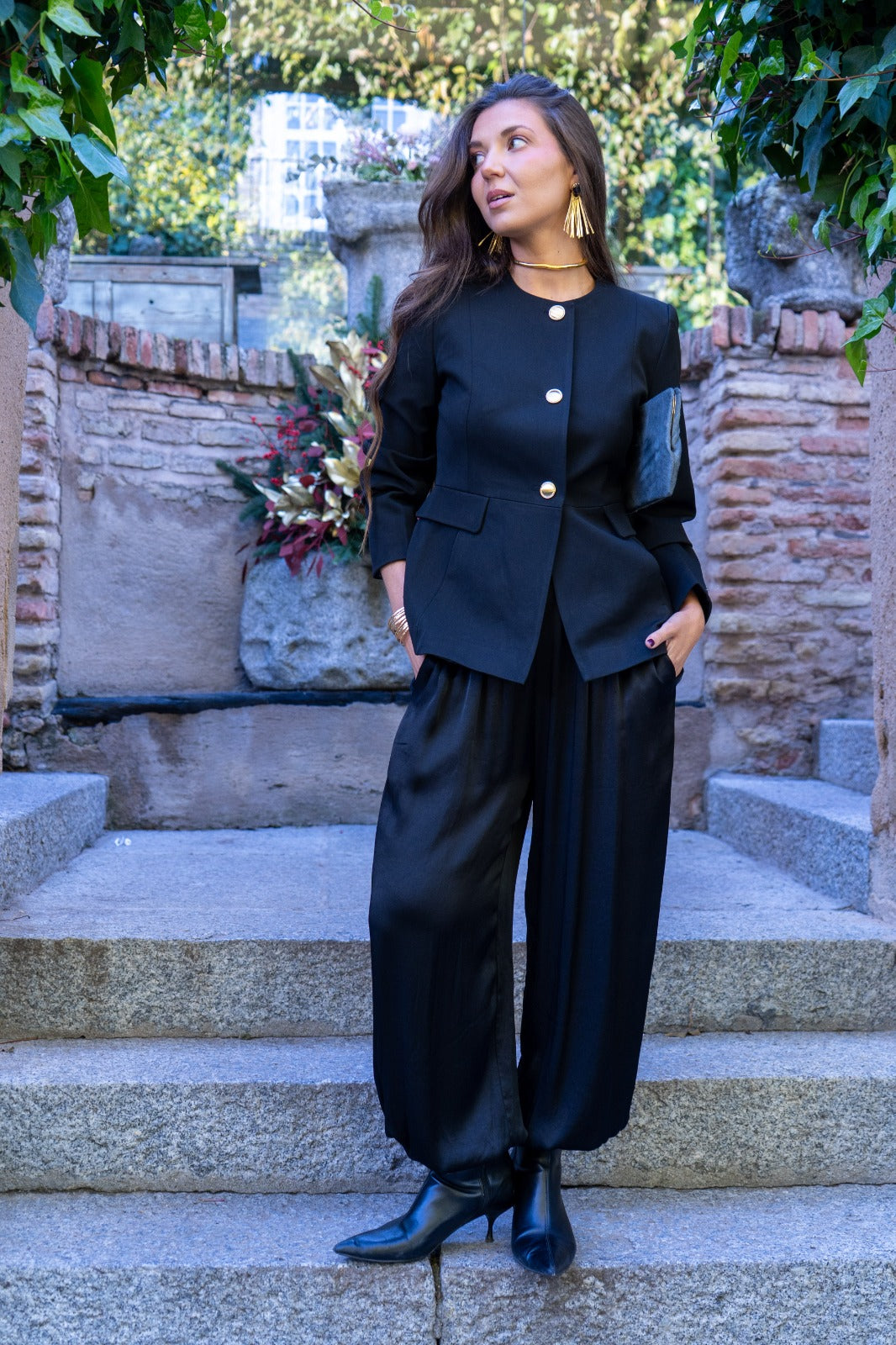 Pantalón bombacho, goma en cintura, bolsillos laterales, goma en el bajo. En tejido satinado negro.