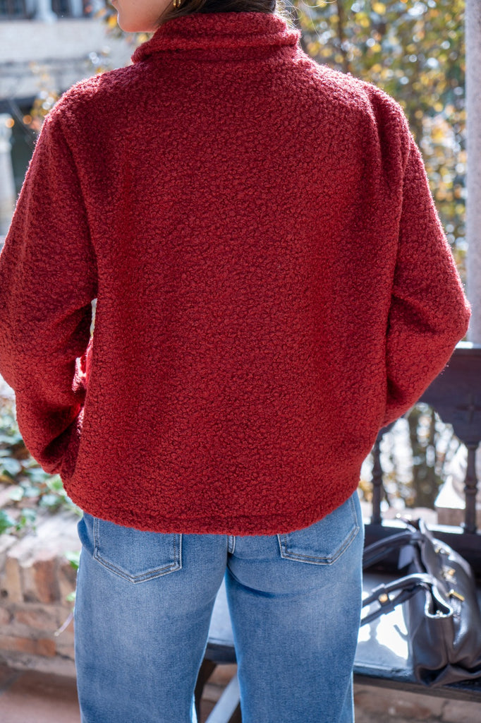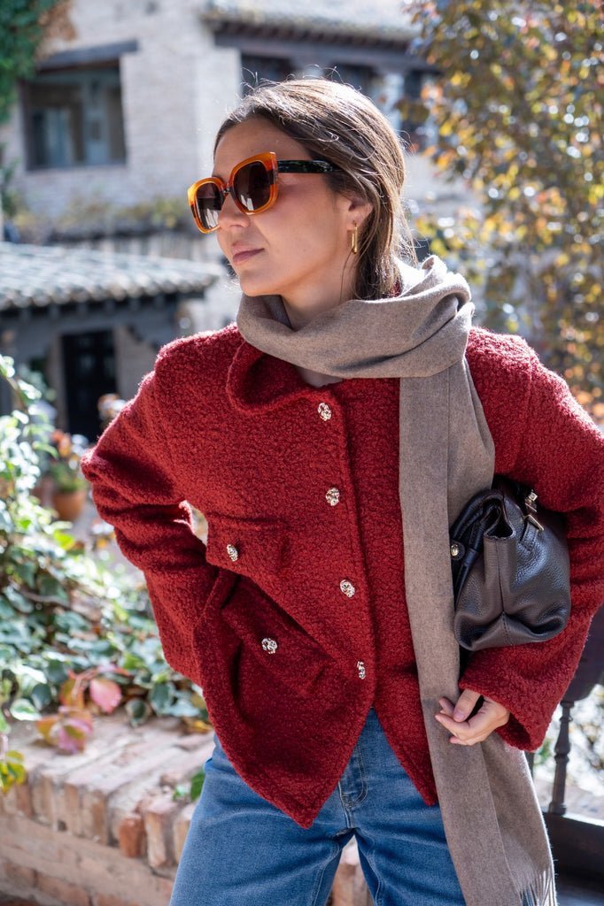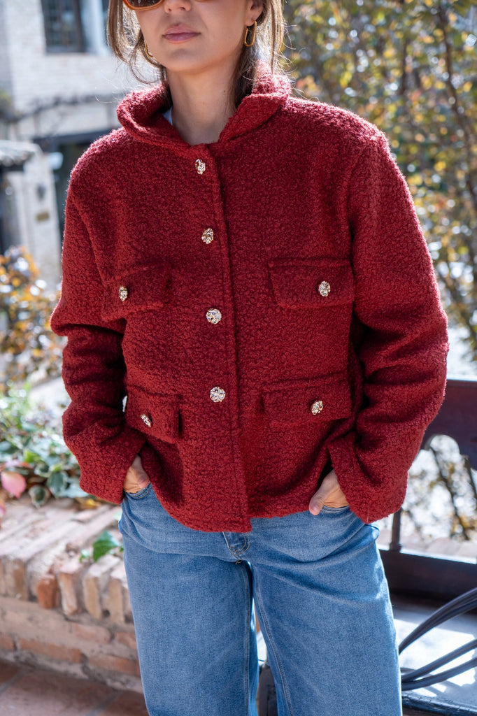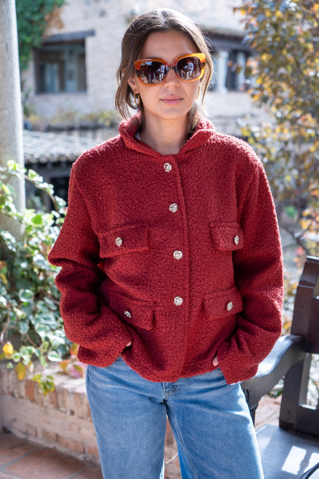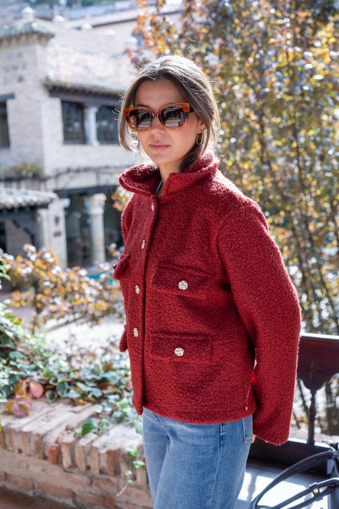 Jacket with lapel collar, faux pocket flaps, button closure. In terracotta color.