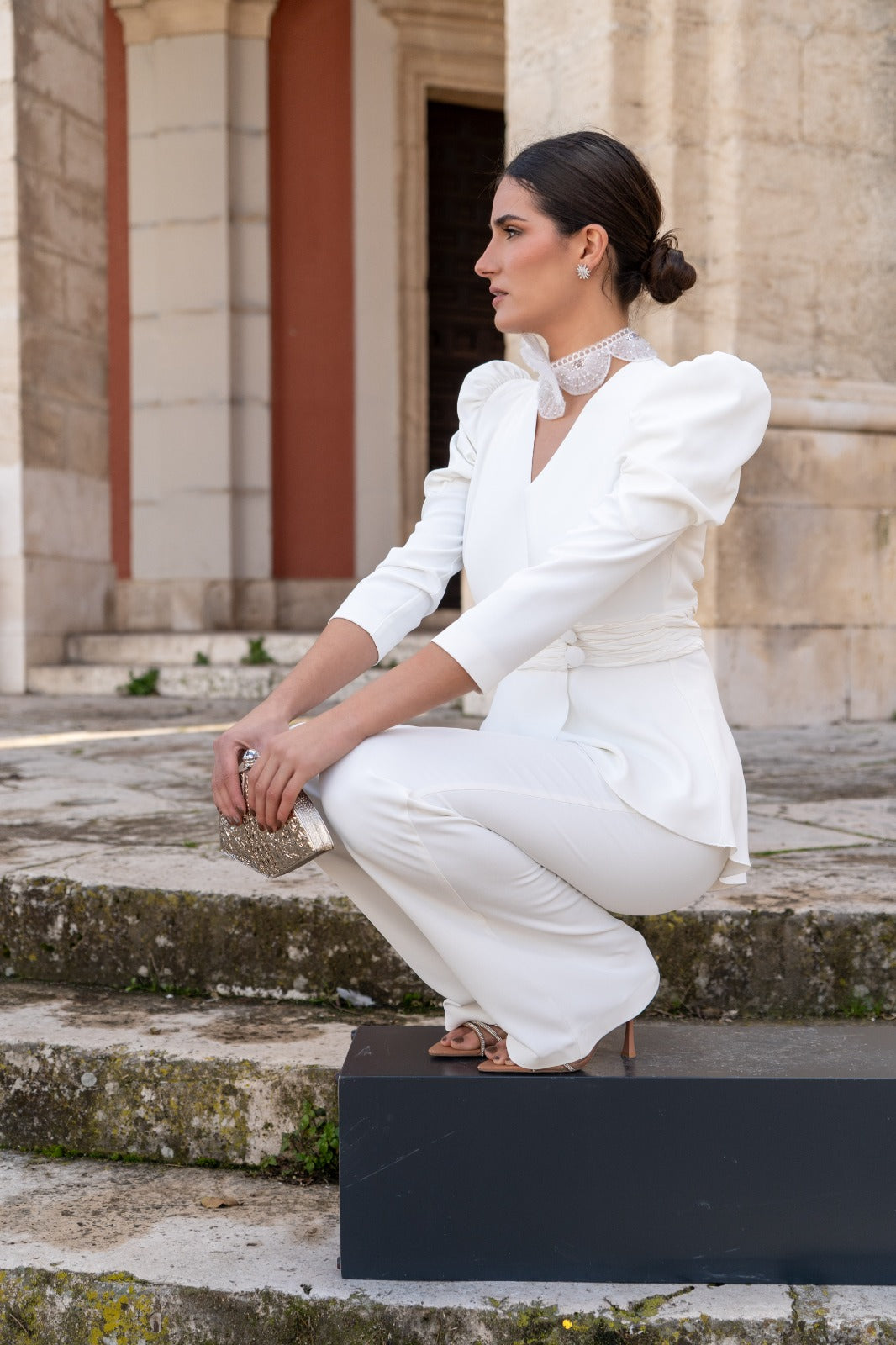 Outfit consisting of a double-breasted jacket with buttons, long puff sleeves and high-waisted trousers, zipper on one side in white.