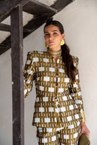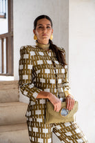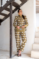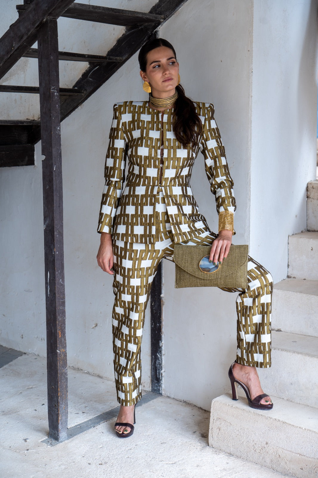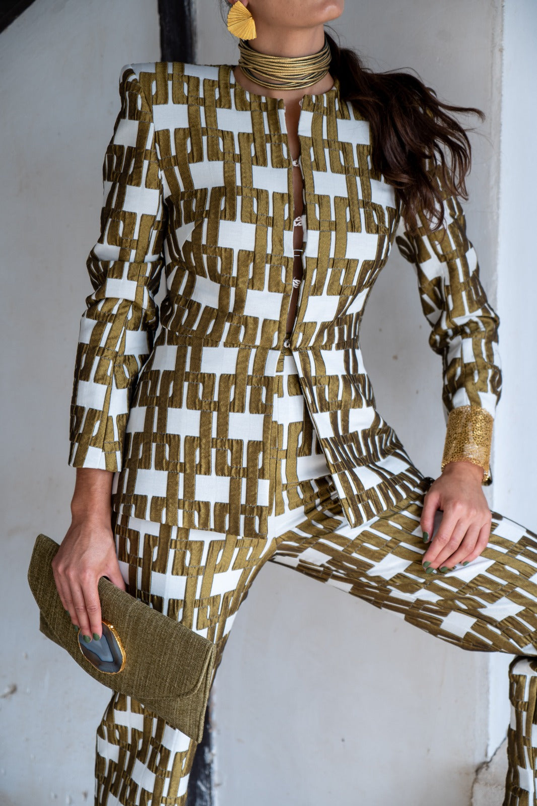 Set consisting of a Jacquard jacket with structured shoulders, a crew neckline, and a center front vent, and high-waisted trousers with a waistband and straight cut. In white and oil.
