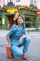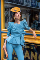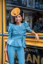 Set featuring a round-neck top with French sleeves, a bow at the front, a ruffle at the bottom, and high-waisted, narrow pants with a back zipper. In blue.