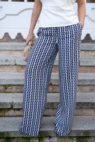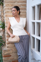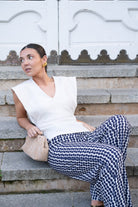 Set featuring a sleeveless, V-neck top and high-waisted pants with a wide zipper on one side. The top is beige and the pants are beige with navy polka dots.